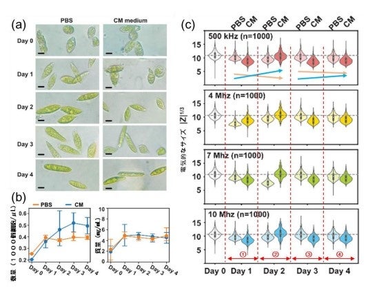 従来の特定のユーグレナ株の選別方法は、顕微鏡下で画像を見るなどの光学的な方法で個別のユーグレナの形状などを判断していましたが、コストや処理能力の改善が望まれていました。そこで、本研究グループは、インピーダンス(電流の流れにくさ)信号を指標に計測するシステムを開発し、マイクロ流体デバイスの中を連続して流れるユーグレナの形状・サイズ、有用物質であるパラミロン合成に直結する細胞小器官(葉緑体)の分布とパラミロンの含有量を瞬時に判別できることを示しました。