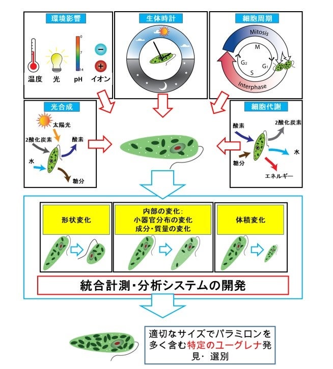 近年、地球温暖化を産業で解決するため、植物や微生物が行う光合成を利用し、工場などから排出される二酸化炭素から有用物質をつくる研究が進んでいます。特にユーグレナは、利用価値が高い多糖類(パラミロンなど)を産み出すため、食品、医薬品、バイオプラスチックの原料としての研究が進んでいます。今後さらに産業での利用を促進するためには、光合成を行う細胞小器官を多く含み、有用物質であるパラミロンの生産性が高い特定のユーグレナ株の選別が鍵となります。
