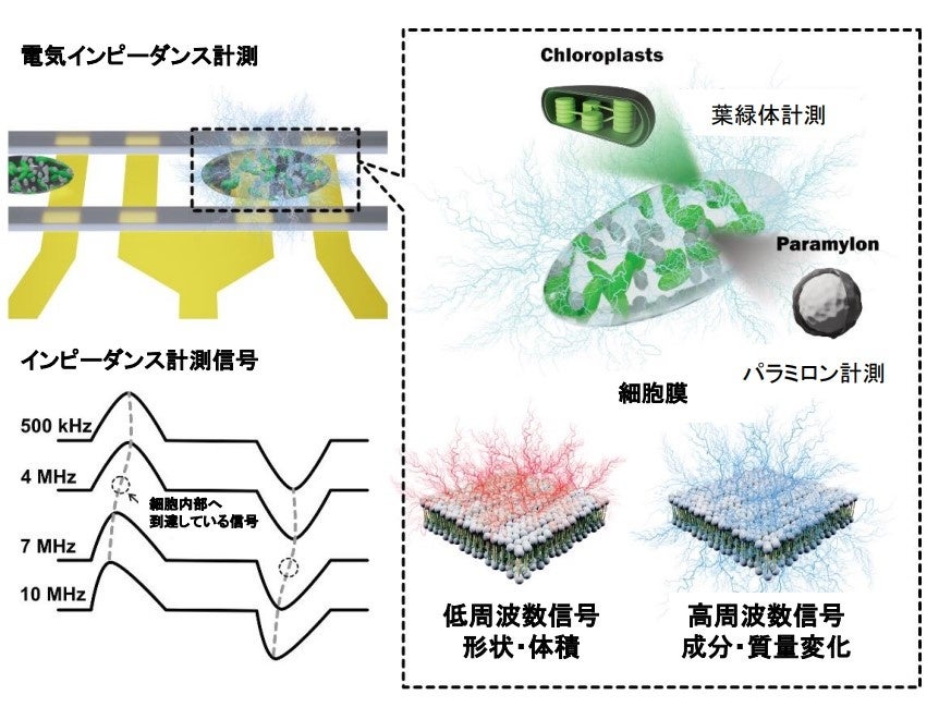本研究グループは、マイクロ流体デバイスの流路に配置した微細な電極間に複数の異なる周波数の交流電圧を印加し、その電場に進入したユーグレナなど対象によるインピーダンス信号の変化を計測します(図2)。細胞の特定成分の含有量を信号の振幅として、サイズ(体積)を信号幅として、形状(または細胞小器官の分布)を偏心率(信号の立ち上がりと立ち下がりのズレ)として計測します。さらに、複数の周波数の電場を利用することによって、異なる細胞の部位(細胞膜、細胞質、細胞小器官)をそれぞれ判別できます。例えば、500 KHzの信号は細胞膜を通過できないため、信号の特徴は細胞の形状・サイズと相関関係があります。10 MHzの信号は、細胞膜を通過できますが、2重膜構造の葉緑体、結晶構造のパラミロンなど細胞小器官で減衰するため、葉緑体・パラミロンの含有量・分布と相関関係があります。結果として、インピーダンスを測定するだけで細胞外部形状・サイズ変化とパラミロンの含有量変化を得ることができます。