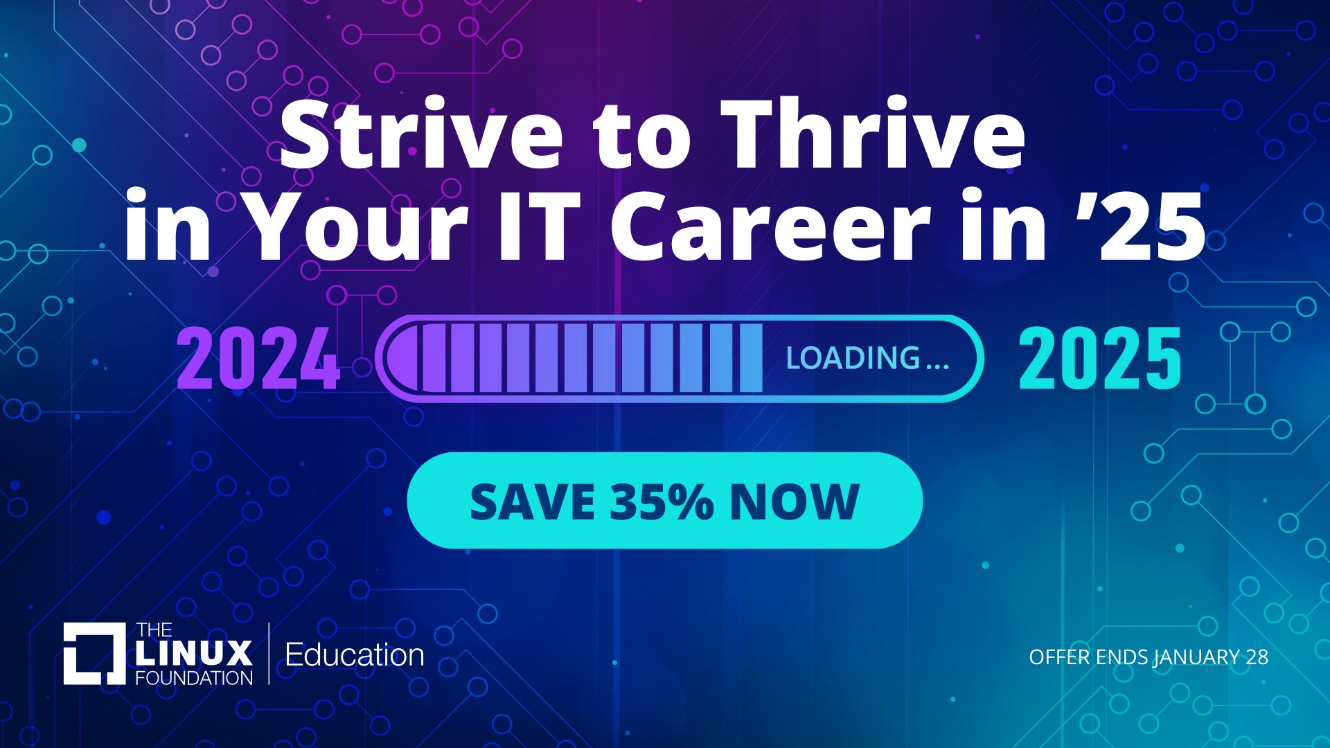 今年はキャリアをどのような方向に進めたいですか?昇進や転職のために、新しいスキルや資格は必要ですか? Linux Foundation Educationで2025年もキャリアアップを目指しましょう!トレーニング&認定試験のラインアップが幅広く35%オフになる1月のキャンペーンをご利用ください。