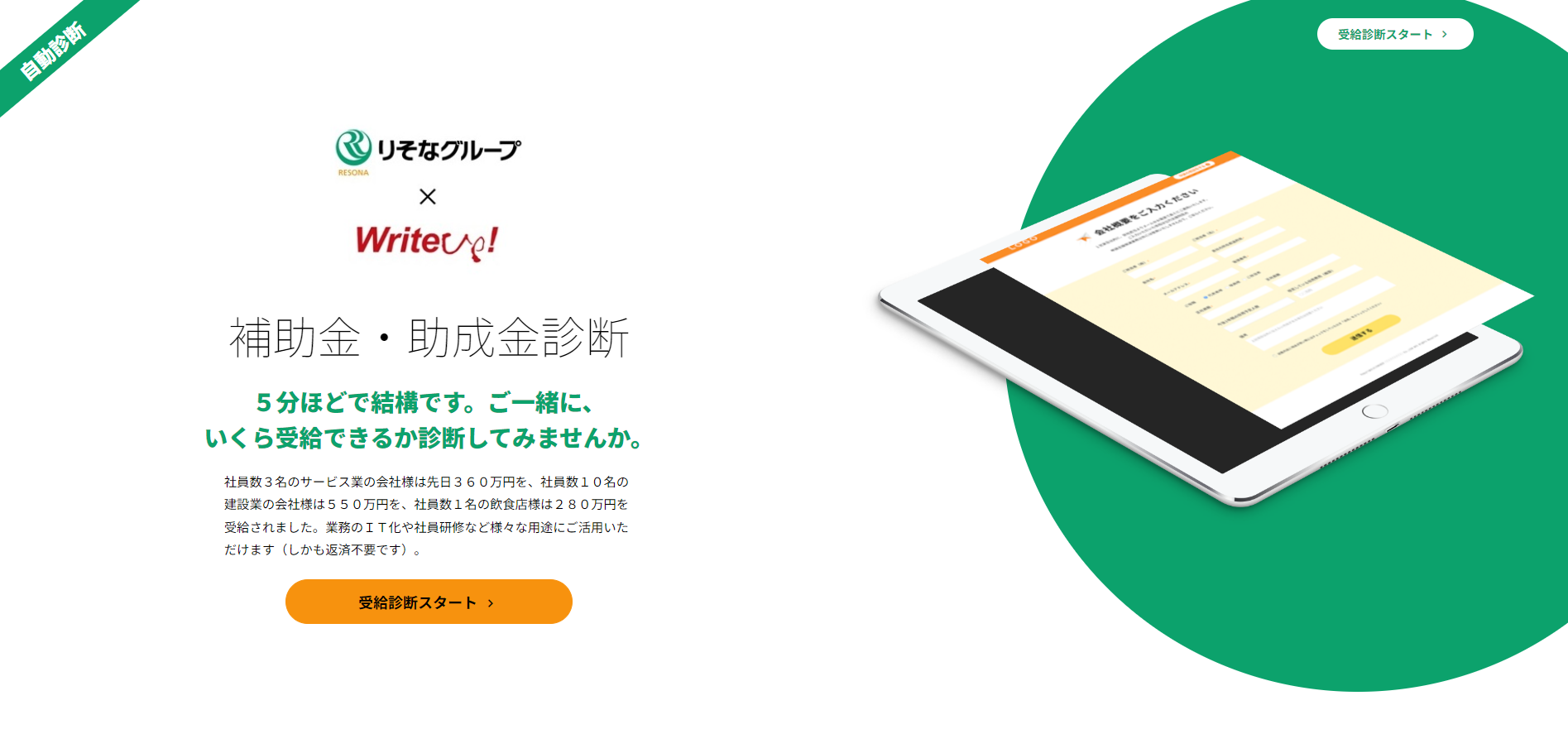 最新の補助金・助成金を各企業ごとに自動診断できるシステムをご提供いたします。インターネット上で、各企業ごとに受給可能性が高い補助金・助成金を、無料で、数分で調べることが可能となります。