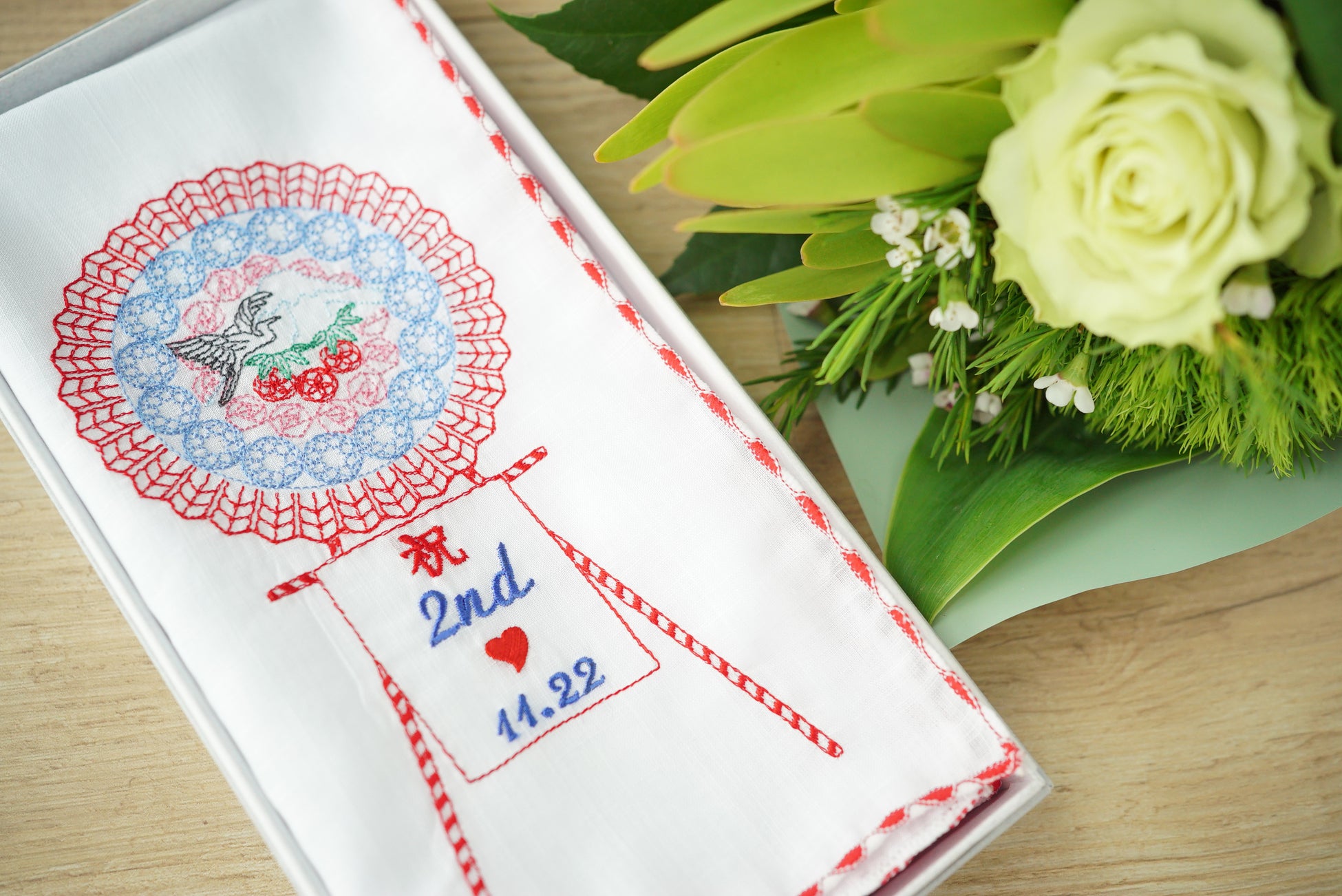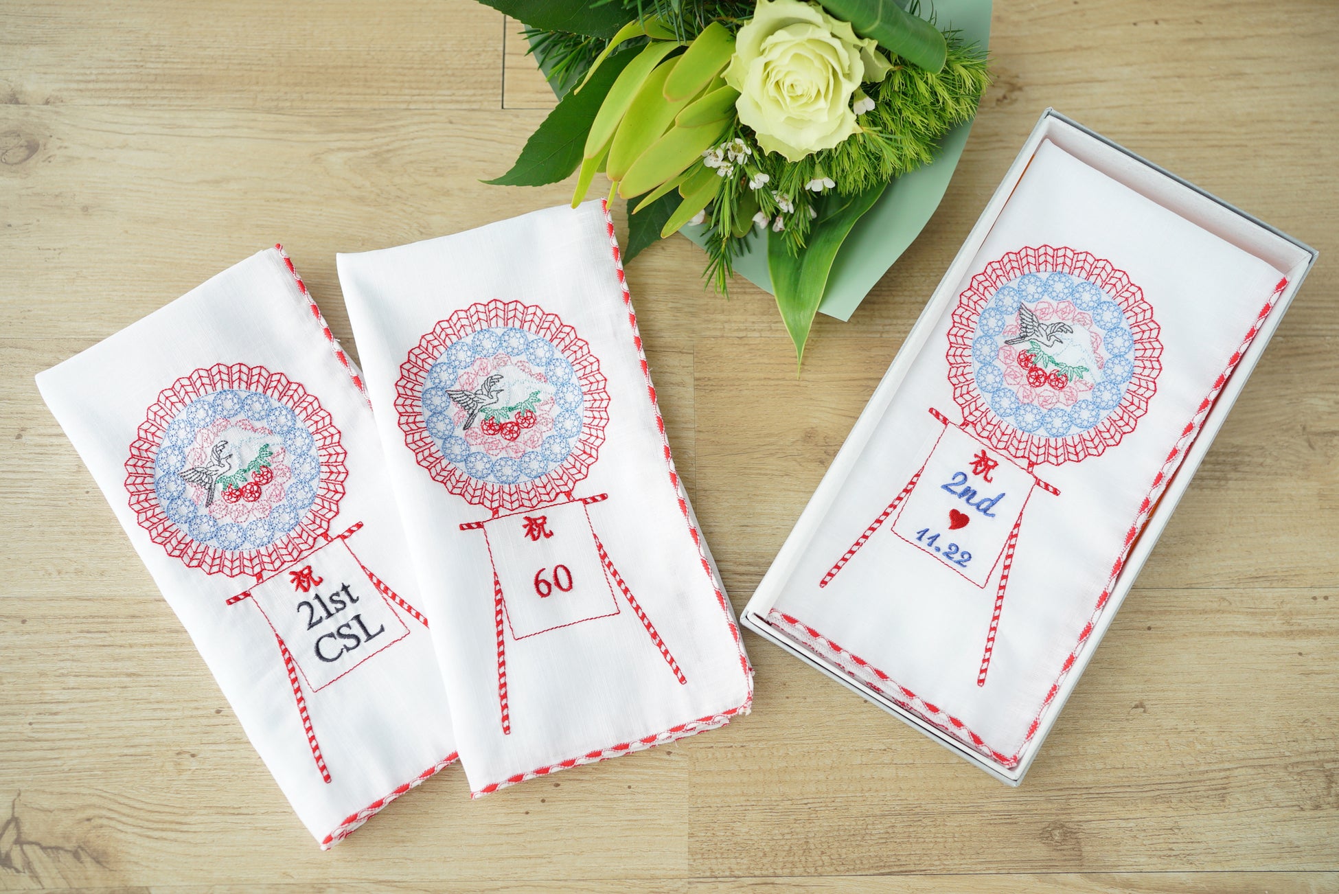 周年記念には、周年×店舗名を組み合わせてお祝いの一枚に。還暦のお祝いには、ダイナミックに60の数字を入れて華やかな一枚に。刺繍の糸色は赤がおすすめです。また、2年目の結婚記念日のギフトに「綿婚式」にちなんで、綿100%のハンカチを贈ってみるのはいかがでしょうか。2周年にハートのモチーフ刺繍と結婚記念日を施して特別な一枚に。