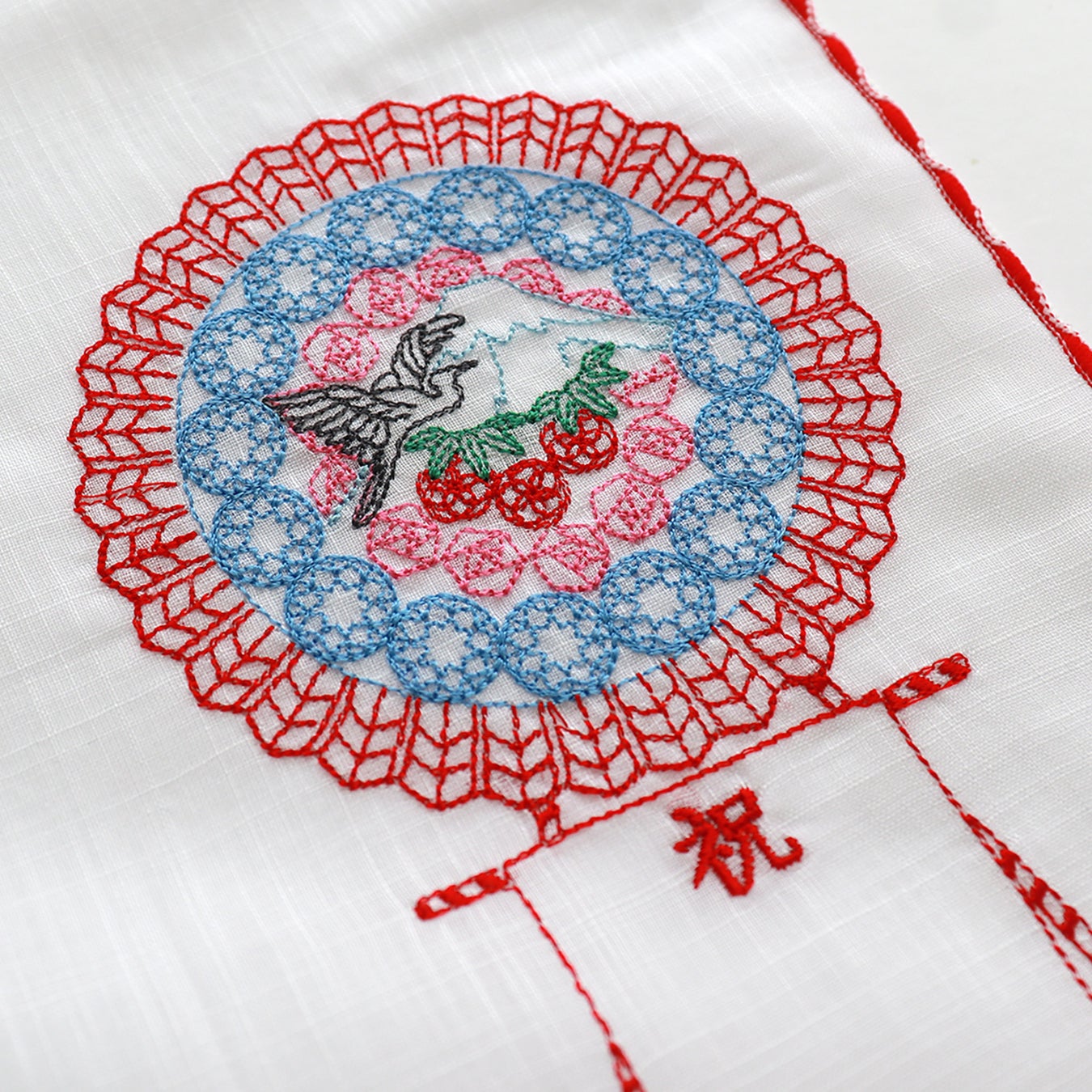 富士山、鶴、松といったおめでたいモチーフに、バラとダイヤをあわせて、ブランドオリジナルの花輪をデザインしました。縁の縫製は、紅白の2色の糸を使ったメロー巻きで、おめでたいカラーリングに仕上げました。