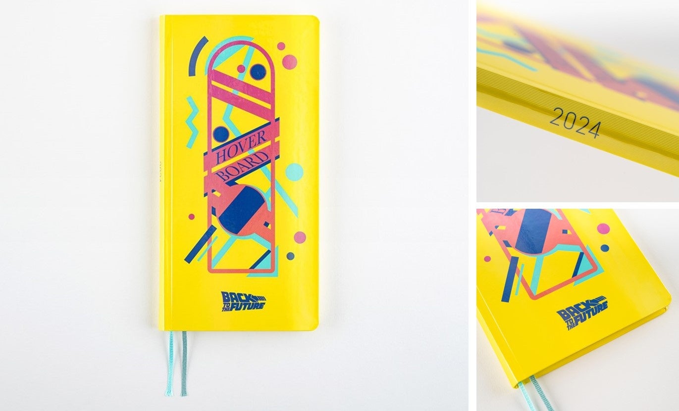 週間タイプのweeksは、PART 2で主人公のマーティ・マクフライが乗りこなす、宙を浮くスケートボード「ホバーボード」をモチーフにつくりました。鮮やかなイエローの表紙にプリントされた