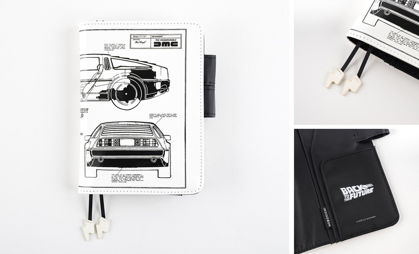 オリジナル(A6)サイズ用のカバーは、エメット・ブラウン博士(ドク)の作ったタイムマシンの設計図をモチーフにつくりました。やわらかなエネメル素材の白いカバーに、ドクの愛車を改造した車体の設計図をプリント。2本のしおりのチャームには、タイムマシンを稼働させるために、劇中でエネルギー源となった雷をあしらいました。カバーの内側は黒で、右側のポケットには「Back to the Future」のロゴをプリント。