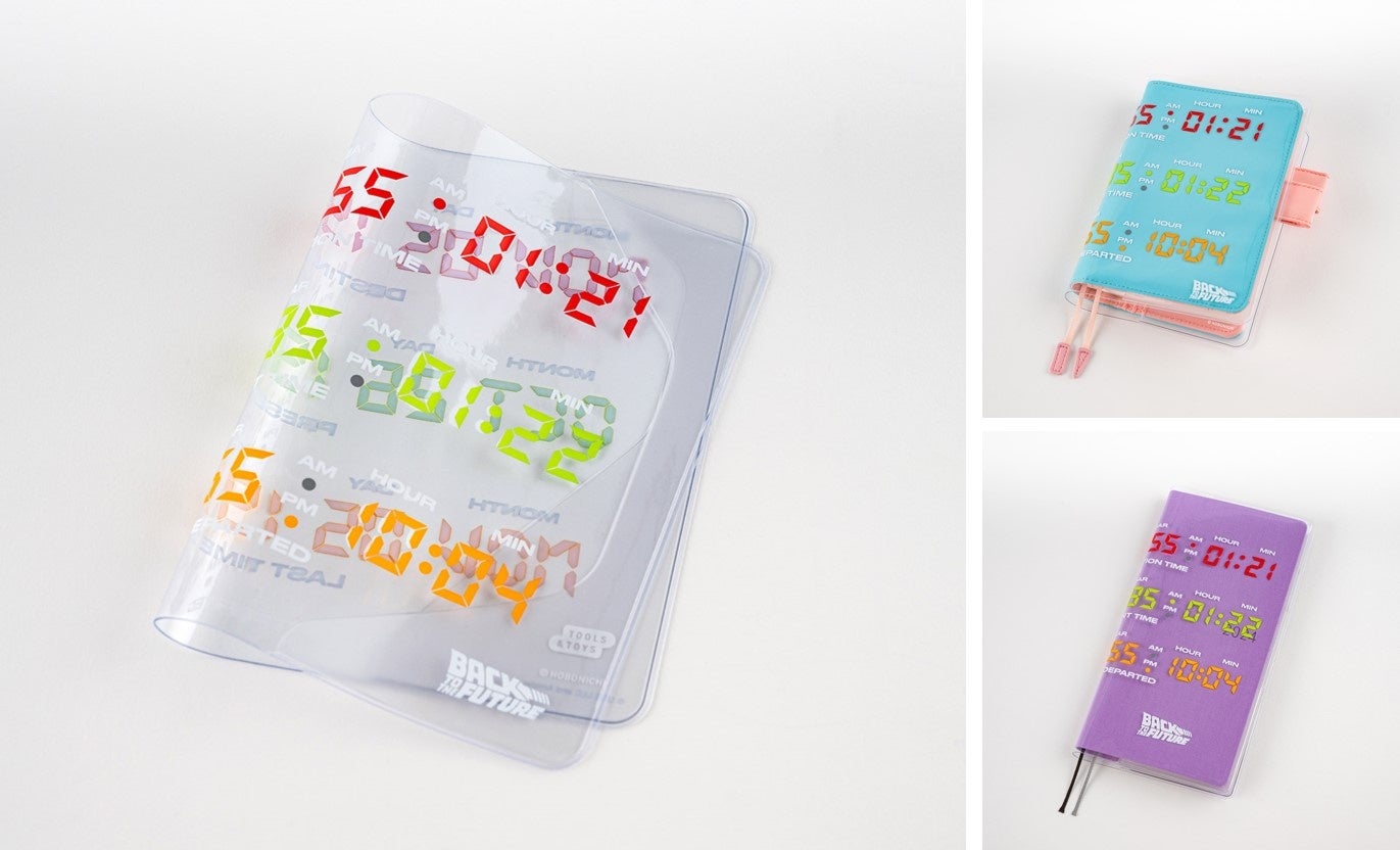 ほぼ日手帳カバー用の「カバー・オン・カバー」とweeks用の「クリアカバー」は、それぞれに装着して、傷や汚れを防ぐアイテムです。今回のコラボデザインでは、タイムマシンに搭載されている、タイムスリップの行き先となる時間を設定する装置をモチーフにしました。無地のカバーやweeksにこのクリアカバーをかければ、あっという間に「Back to the Future」仕様になります。