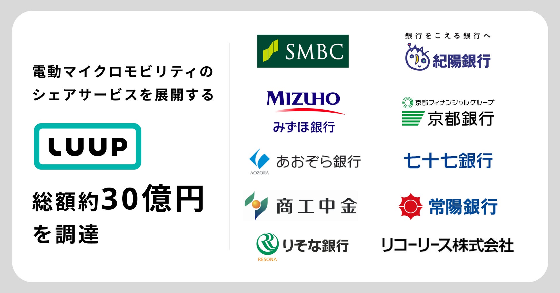 株式会社Luup(本社:東京都千代田区、代表取締役CEO:岡井大輝、以下「Luup」)は、デットファイナンスにより30億円の資金調達を行いました。うち、15億円がグリーンローン(※2)となります。本調達によりLuupの累計調達額は約166億円となり、マイクロモビリティ業界では初(※3)となるグリーンローンによる調達を行いました。Luupでは、調達した資金を活用し、増加する需要に対応して事業拡大を加速させてまいります。