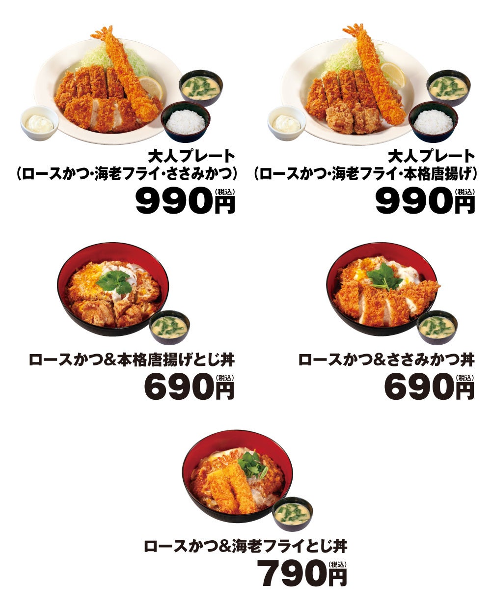 いつものかつ丼や盛り合わせ定食に「海老フライ」「唐揚げ」「ささみかつ」をプラスワン