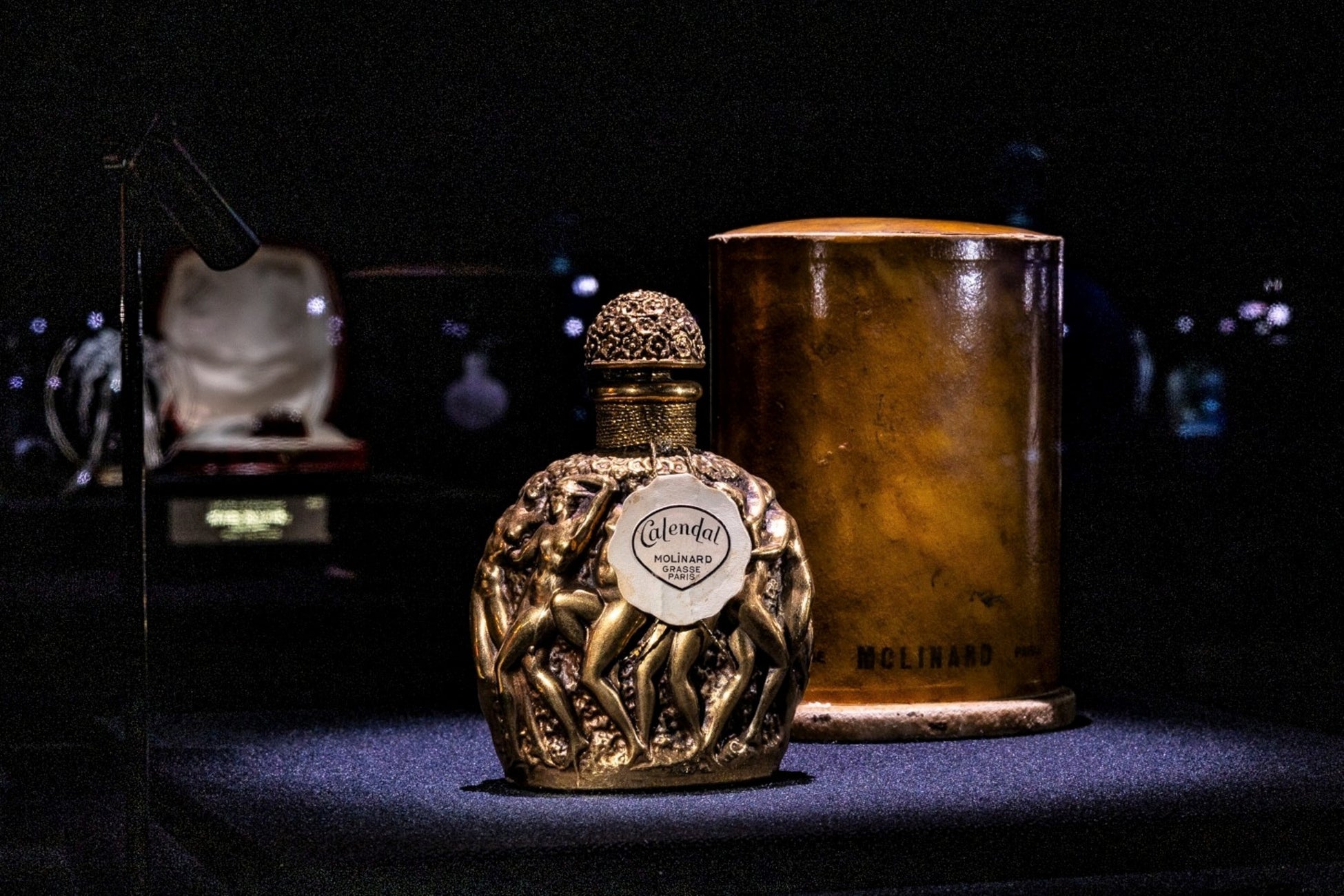 モリナール社のために制作された本香水瓶は、Marcillhacのカタログ・レゾネ(M2、p.946)に掲載されている重要作品です。花頭文様を低浮彫で表した栓と、植物文様の中で裸身の女性ダンサーが帯状に巡る中浮彫の瓶胴を特徴とし、高さは12.1cm。24金メッキを施した仕様は当時として極めて異例で、制作数はわずか6点に限られています。浅浮彫と中浮彫を巧みに使い分け、金彩によって光と陰影の効果を最大限に引き出している点も特筆すべき点です。90年以上を経た現在も、未開封のオリジナル香水、紙ラベル、箱を完備した保存状態は極めて希少で、1989年1月号『Forbes』誌に図版付で紹介された由緒ある作品です。香水名“Calendal”は、南仏文学との関連が指摘される名称であり、地中海的な官能性と古典的精神を想起させます。