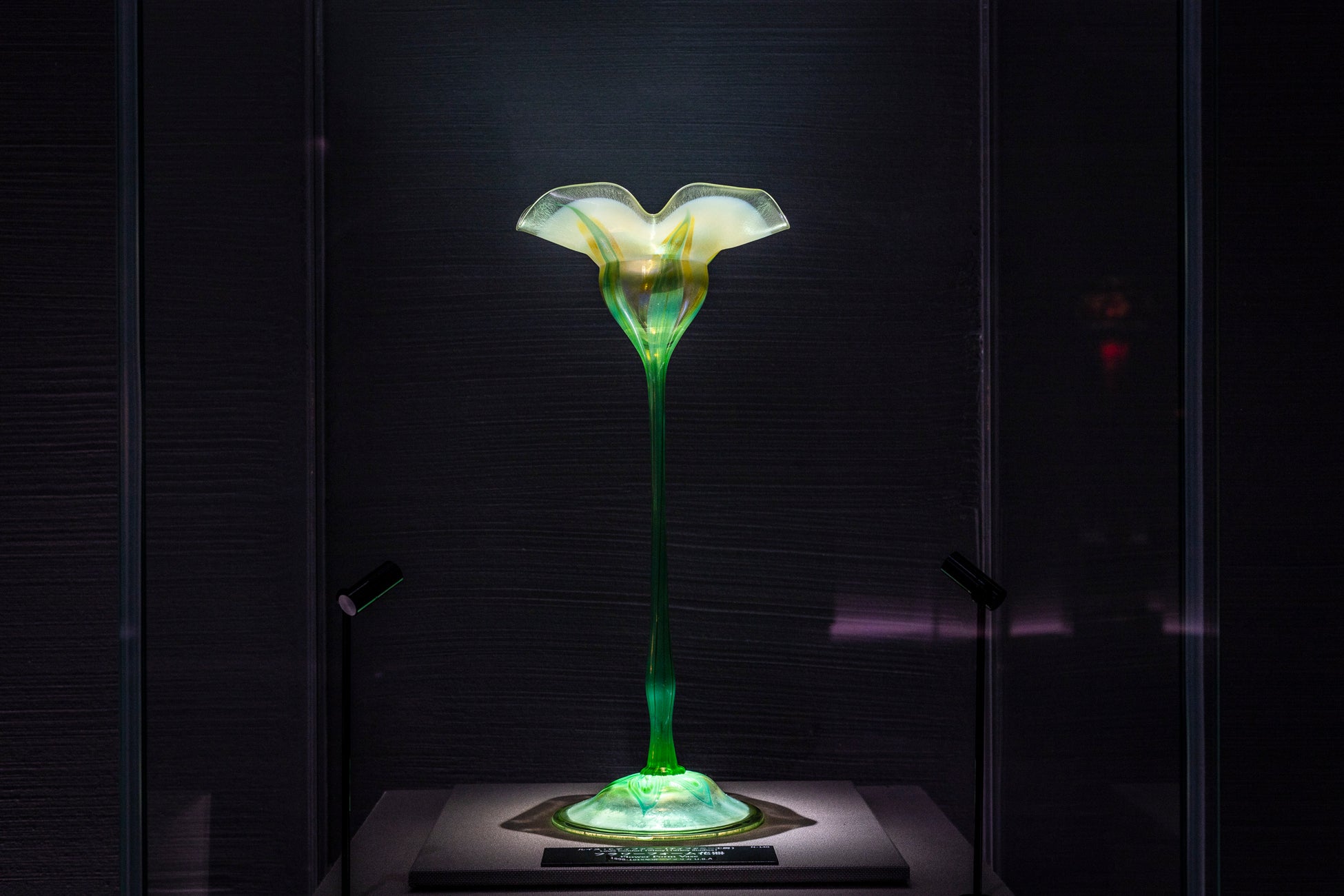 アメリカの装飾芸術家ルイス・C.ティファニーによる優美な花器です。最も特徴的なのは、底部の円形ベースから立ち上がる細いステムに施された繊細な緑色の葉状装飾と、上部で花冠状に優雅に開く乳白色のカップとの美しい対比です。この造形を支えたのが、独自に開発し特許を取得した「ファブリルグラス」です。成形過程で金属化合物を混入させることで生まれる虹色の光沢は、単なる着色では出せない深みとサテンのような質感と輝きが、植物の生命力と儚さを表現しています。20世紀初頭のアール・ヌーヴォー様式を体現しながら、単なる花の写実的模倣ではなく、植物が成長し開花するプロセスそのものを芸術的に昇華した作品です。硬質なガラス素材を通して自然の柔らかさを表現した、ティファニー独自の美意識と高度な手吹きガラス技術が結実した傑作として、制作から一世紀を経た現在も普遍的な美しさを放ち続けています。