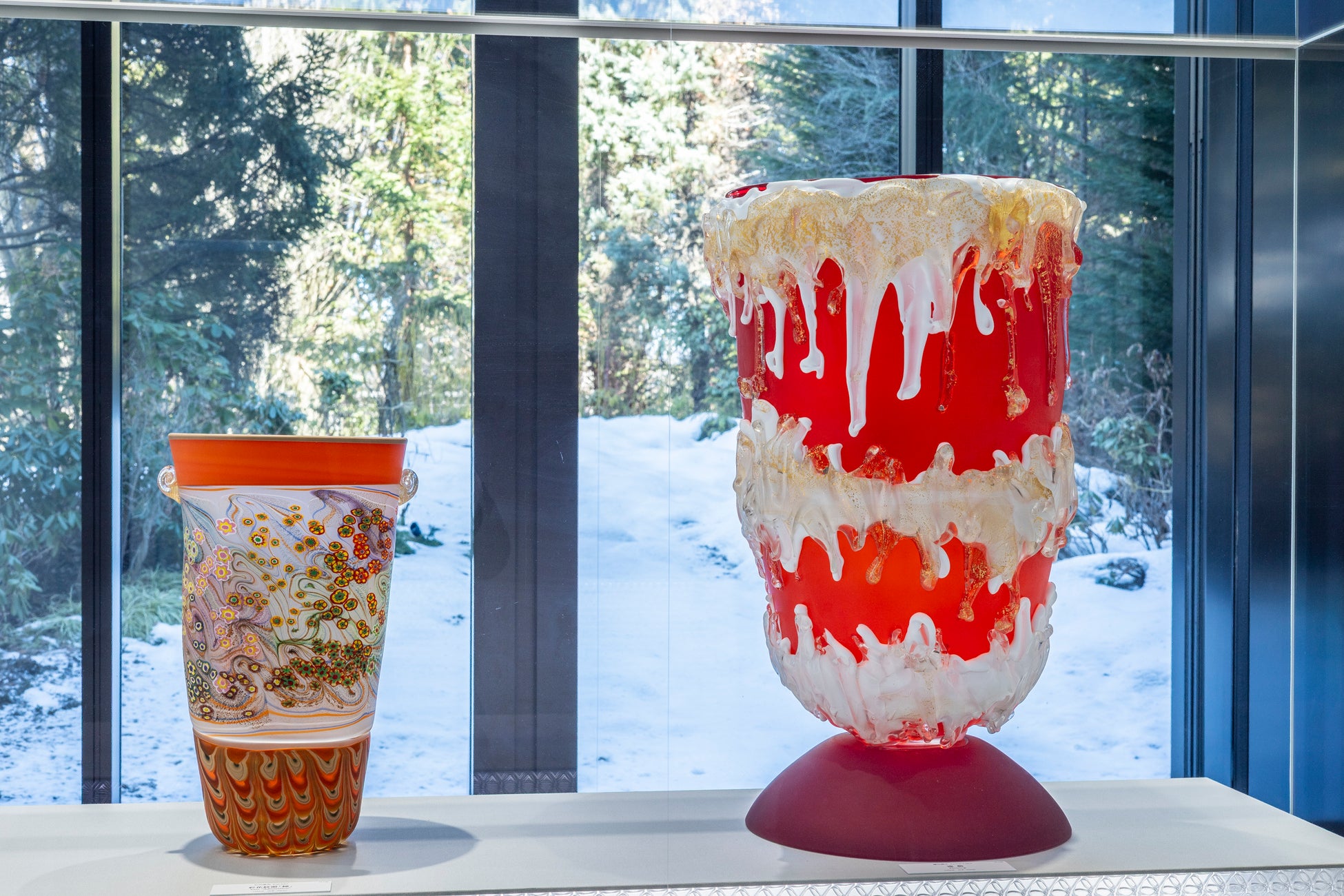 本展では、自然光や展示照明を受けることで表情を変える作品が随所に配置されています。エナメル彩の繊細な陰影、照明と一体化した彫刻が生み出す光の揺らぎ、そして空間全体に色彩を落とす大型作品。ガラスが光を受けてはじめて立ち上がる素材であることを、時代の異なる作品を通して体感できます。