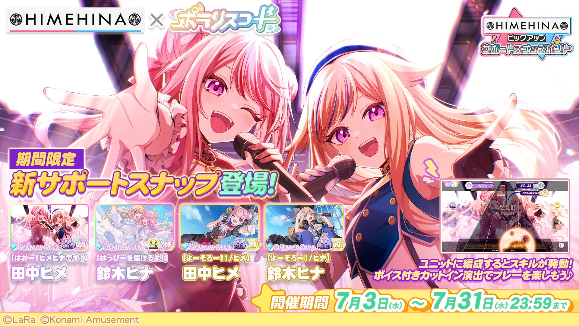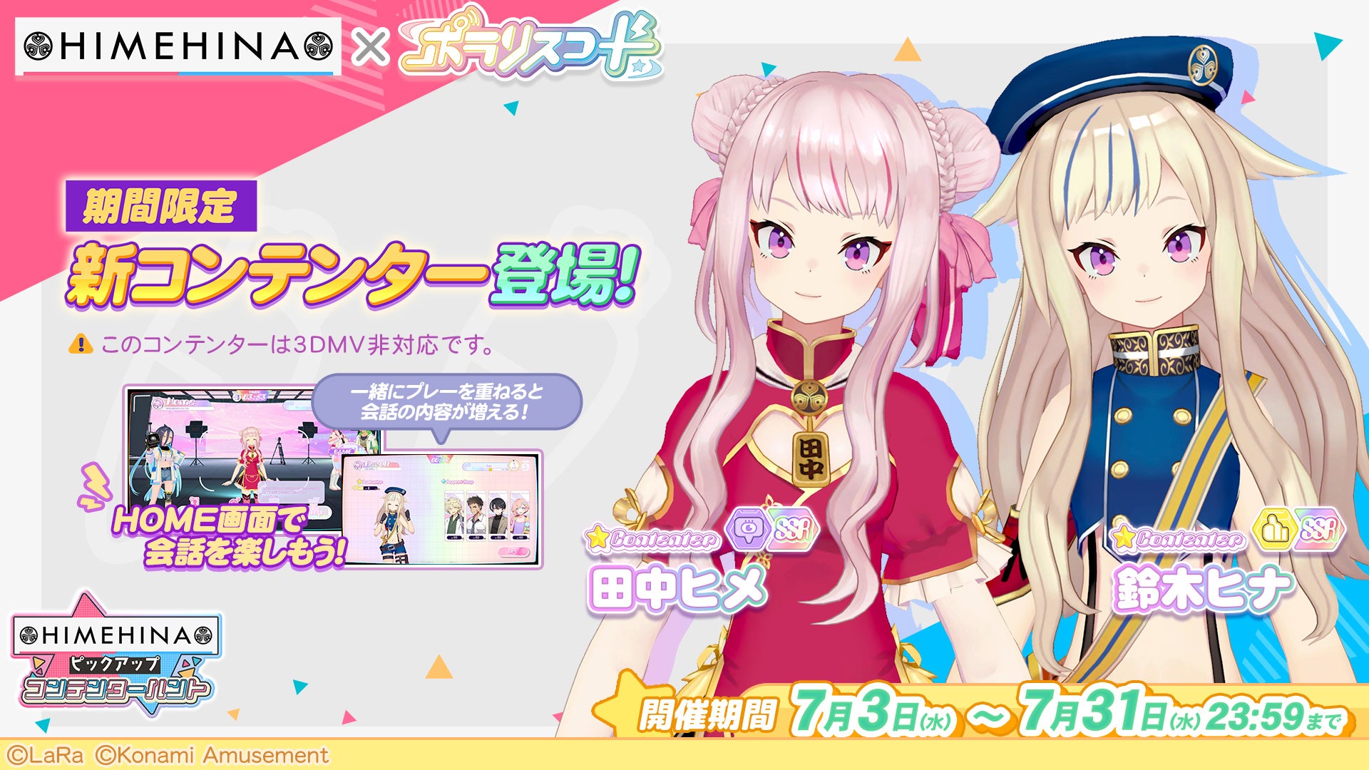 株式会社コナミアミューズメントは、全国のアミューズメント施設にて音楽ゲーム『ポラリスコード』と、株式会社LaRaが運営する「田中ヒメ」と「鈴木ヒナ」によるバーチャルアーティスト『HIMEHINA(ヒメヒナ)』とのコラボレーションイベントを7月3日(水)から開催することをお知らせします。