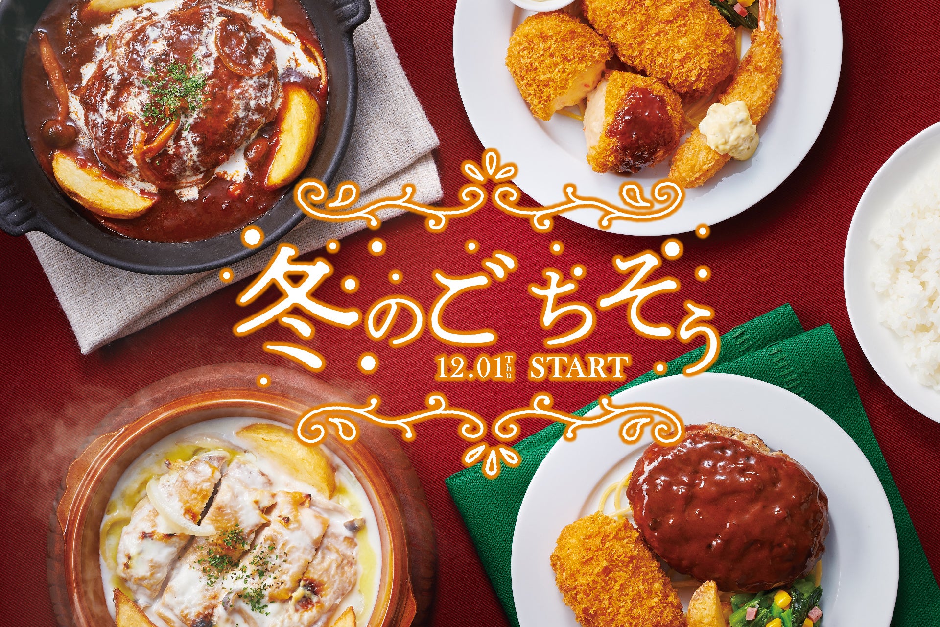 さらに、洋食の定番「カニクリームコロッケ」が味わえるメニューも同時発売。贅沢にハンバーグと合わせた『カニクリームコロッケ&グリルハンバーグ(デミ)プレート』820円や、たっぷりカニクリームコロッケが味わえる『カニクリームコロッケ&えびフライプレート』720円など多数ラインナップ。寒い冬に味わいたくなる、人気の洋食メニューを幅広くご用意しました。この機会に是非お試しください。