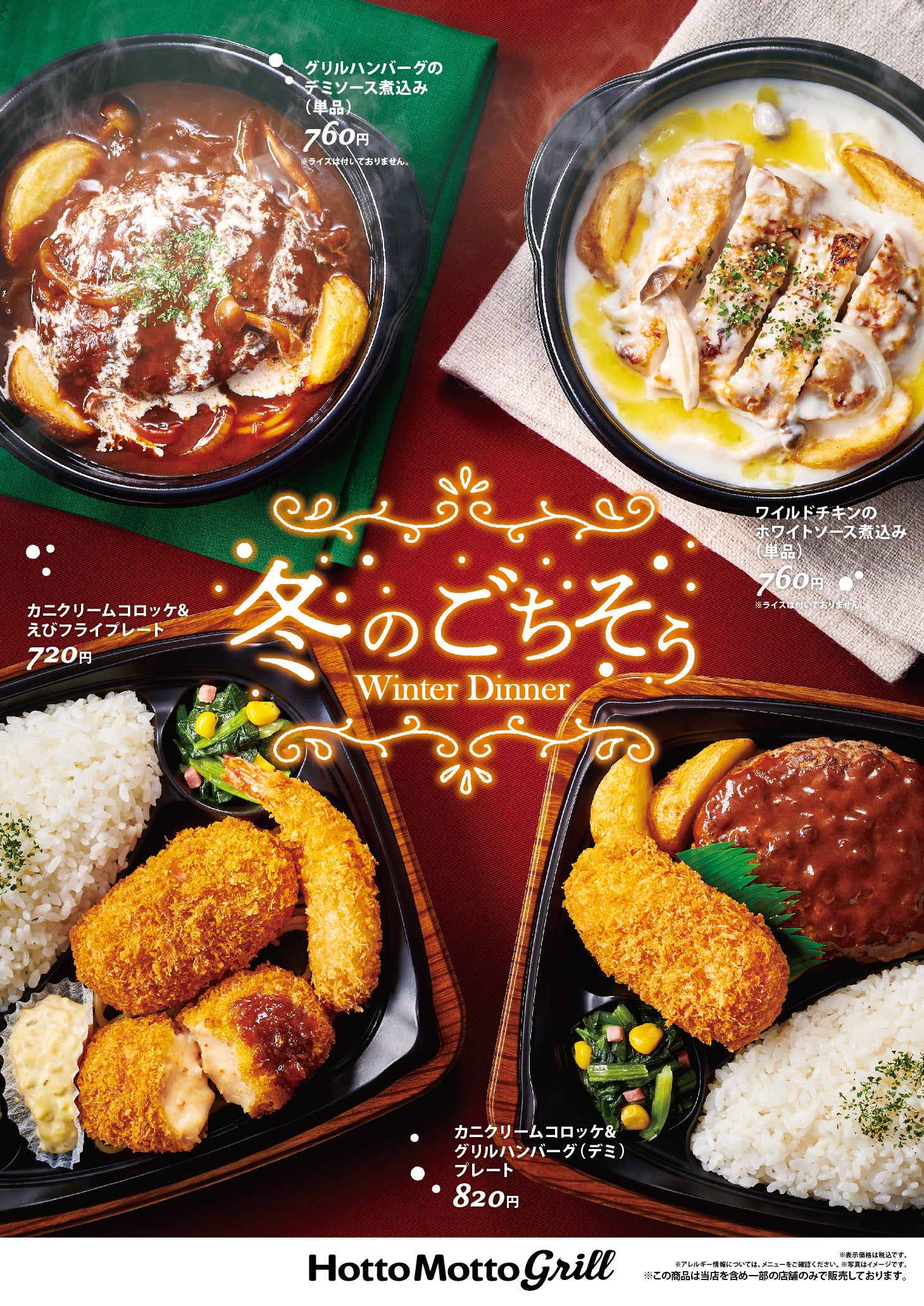 「ほっともっとグリル」“冬のごちそう”が勢ぞろい!自慢の煮込みメニューが、今年は2種の濃厚ソースで新登場!『グリルハンバーグのデミソース煮込み』『ワイルドチキンのホワイトソース煮込み』