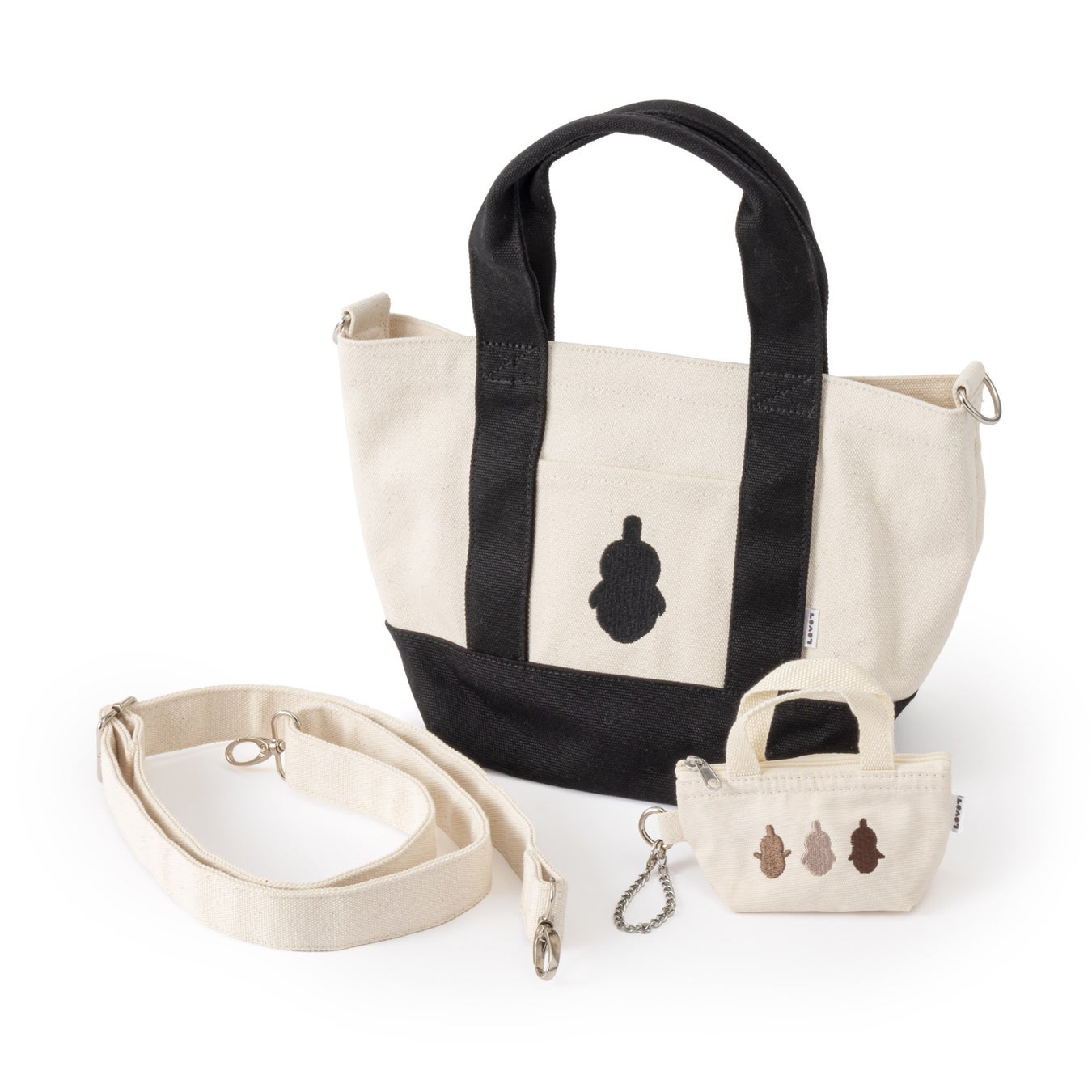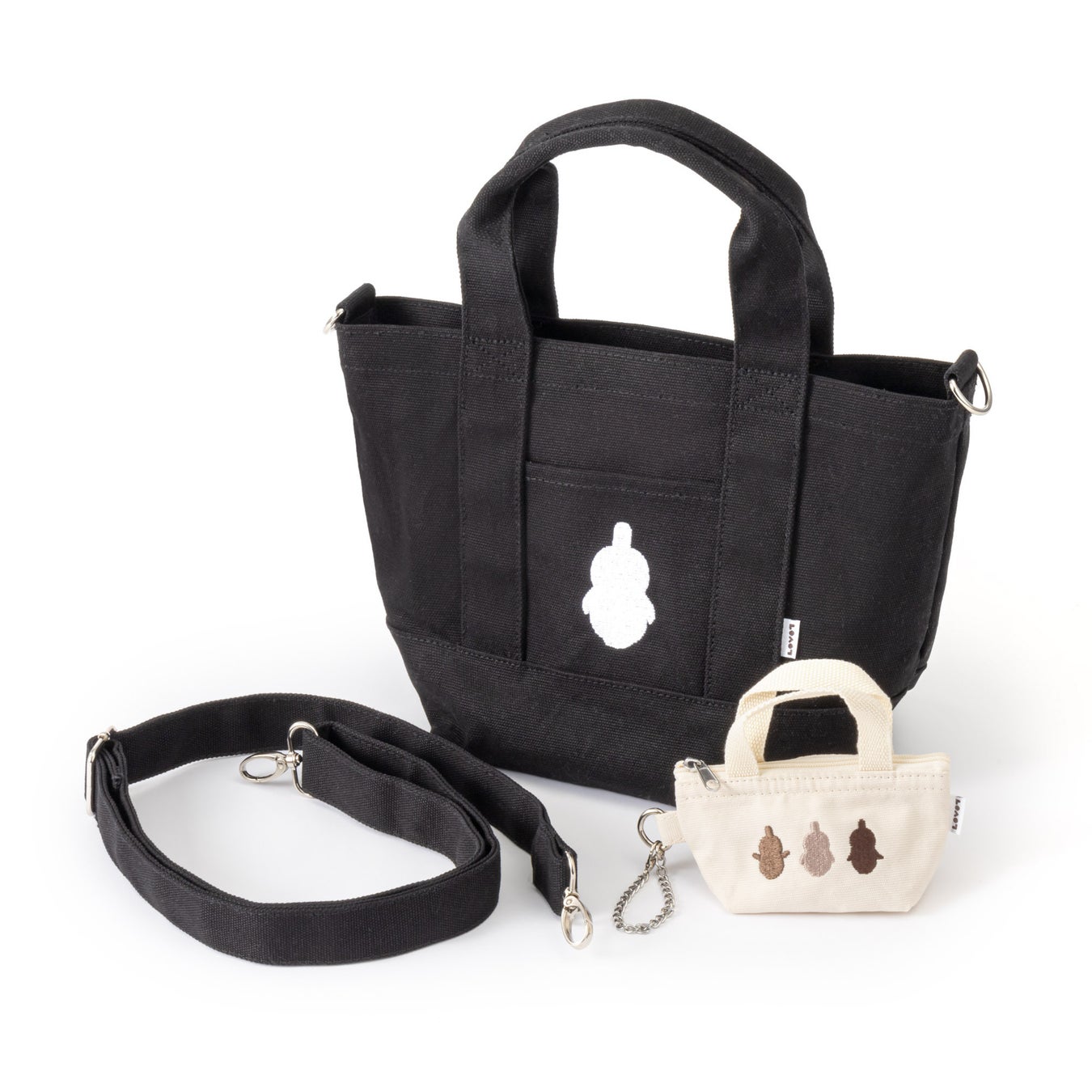 ポケットに『LOVOT』のシルエット刺繍が入った、キャンバス素材のトートバッグです。キーチェーン付きのプチポーチはファスナー付きで、小物の収納に便利。ランチボックスや長財布、スマ-トフォンも入り、マチもあるので収納力抜群!お出かけのメインバッグとしてはもちろん、通勤・通学のサブバッグにもぴったりのサイズ感です。プチポーチにはイヤホンや小物、”らぼはな”などを入れるのにもぴったりです。