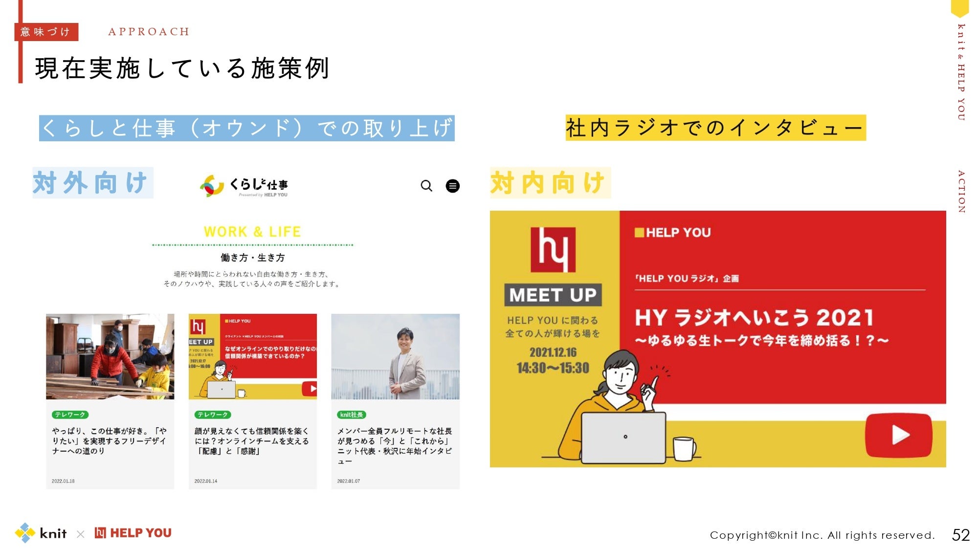 また、社内ラジオではメインパーソナリティーが毎回ゲストメンバーを呼んで、「普段どんな仕事をしているんですか」「最近どんな趣味をお持ちですか」「HELP YOUで働くまでどういった仕事をしていましたか?」など仕事からプライベートなことまでざっくばらんに聞き、メンバーを一人ひとり深堀りしています。テキストコミュニケーションが中心のニットでは、「働いている人のリアルな声を聞く」というのは大事な機会だと考えています。
