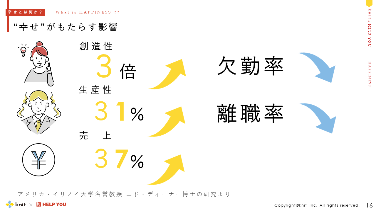 「幸せ(Happiness)」は世界最先端の企業でも注目されている考え方です。働く人が幸せだと、個人だけではなく組織にとってもメリットがあります。アメリカ・イリノイ大学名誉教授のエド・ディーナー博士の研究によると、「幸せ」が個人や組織にもたらす効果として「創造性=3倍」「生産性=31パーセント増」「売上=37パーセント増」が期待できるといいます。これにともない欠勤率や離職率が低下することも組織にとってのメリットです。