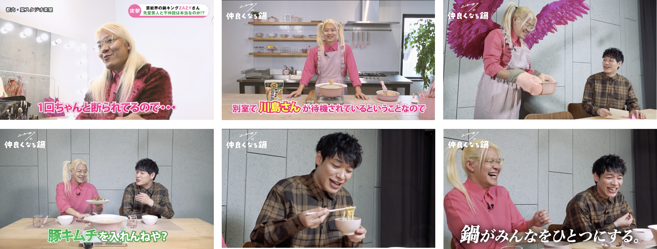 緊張の面持ちで羽をつけ、サプライズ突撃をするまで待機をするZAZYさん。実際に突撃をすると、羽をつけつつ、鍋を持つという出で立ちを不信に思う川島さんから「新ネタ?」と聞かれていました。また、実食シーンでは豚キムチで味変をして、だんだんピンク色になってくる鍋を見て、川島さんが「だんだん出汁をピンクにしたいだけちゃうの?」とツッコミをするシーンもありました。その後、ZAZYさんの鍋の感想を聞かれた川島さんは「ZAZYはやっぱりネタじゃなくて、鍋を作った方がいい。」と言い、ZAZYさんが戸惑う姿も。鍋を囲み、だんだん仲良くなってくる2人、カメラが回っていないところでも、レシピの話など雑談が増えてくる様子が印象的でした。