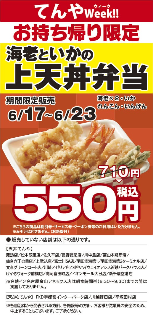 お持ち帰り限定「海老といかの上天丼弁当」 710円(税込)→550円(税込)に