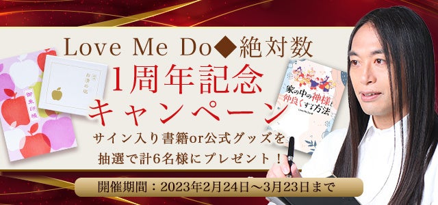 有名人の電撃婚や世界的なビッグニュースの予言を的中させて大人気の占い師Love Me Doの公式サイト『Love Me Do◆絶対数』では、『1周年記念キャンペーン』を開催いたします。期間中、対象鑑定をご購入頂いた方の中から抽選で計6名様に、豪華賞品をプレゼント!直筆サイン入り書籍や公式グッズの御朱印帳、盛り塩セットといった、1周年を記念した特別な賞品をご用意しております。1周年のこの機会に、ぜひ『Love Me Do◆絶対数』をお楽しみ下さい。