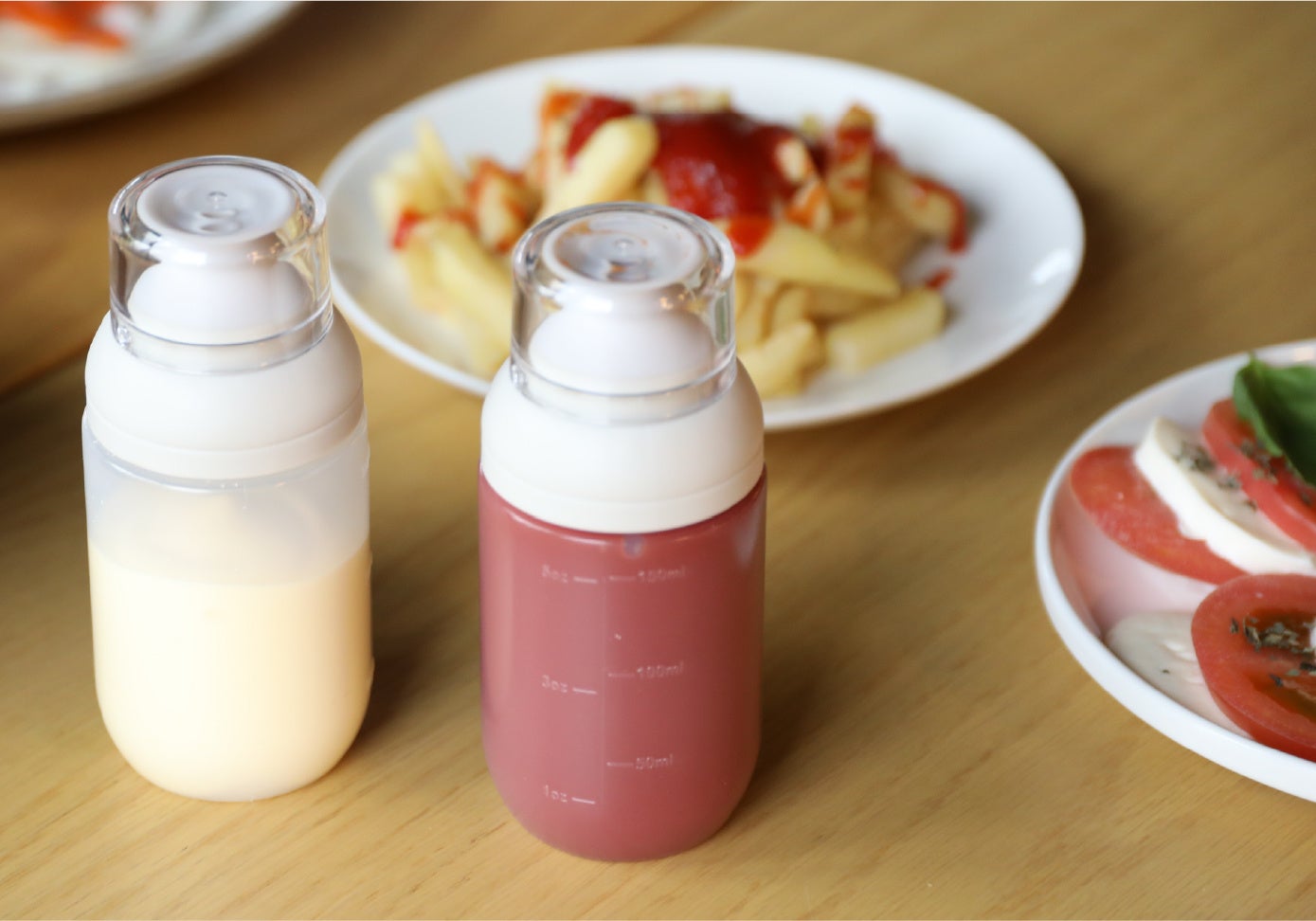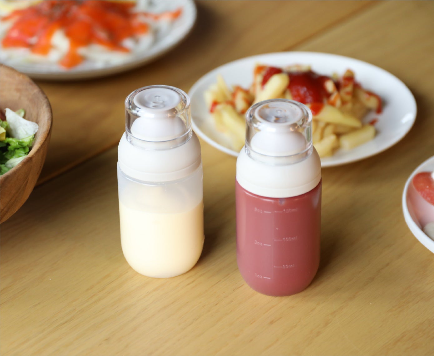 日常の使いづらさを軽減するため、プッシュ式で吐出量をコントロールしやすい調味料ボトル。