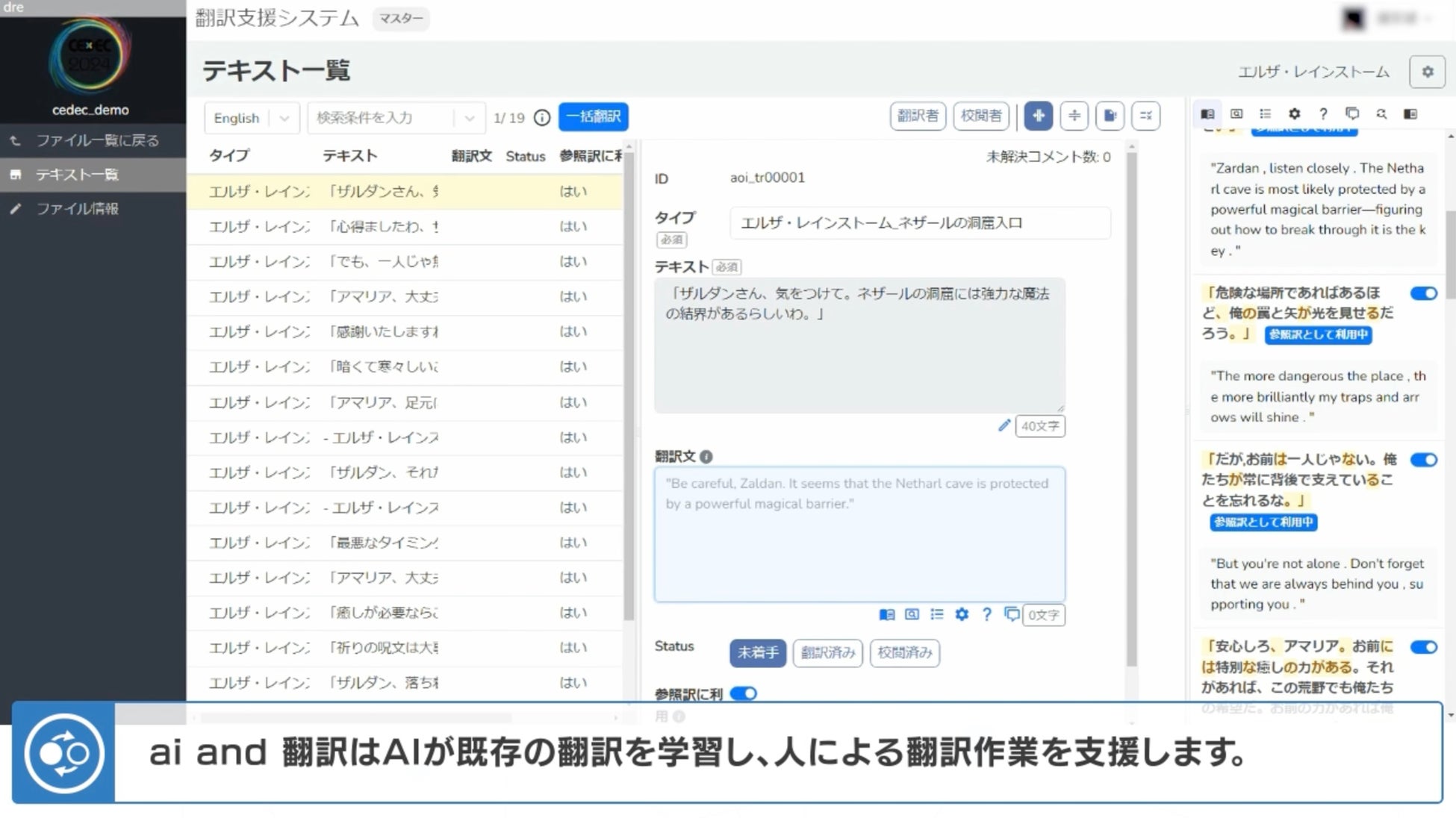AIが既存の翻訳を学習し、人による翻訳を支援。 固有名詞の固定翻訳と過去の翻訳のクセを学習し、IPごとに異なる基本情報を管理。 |
