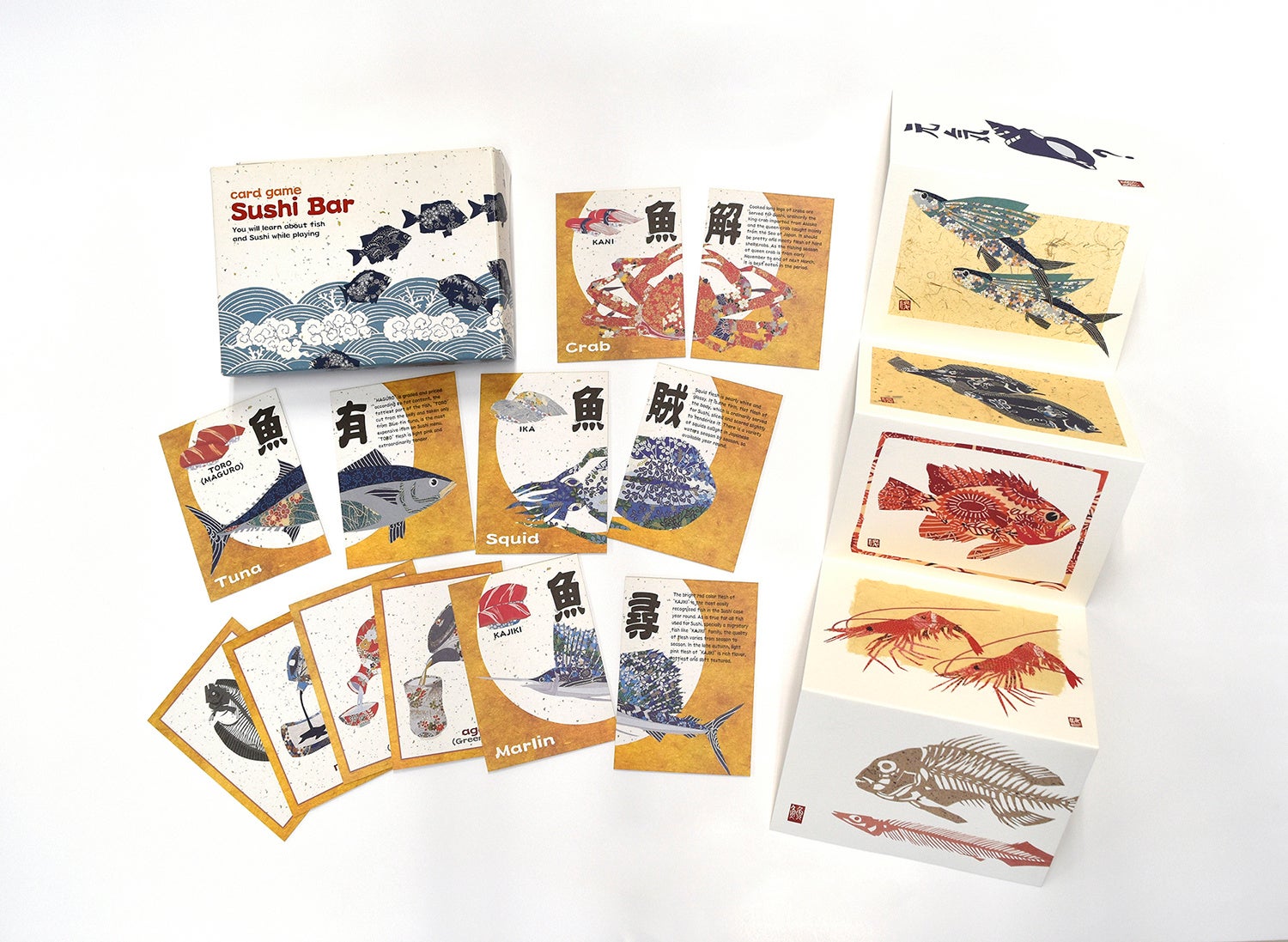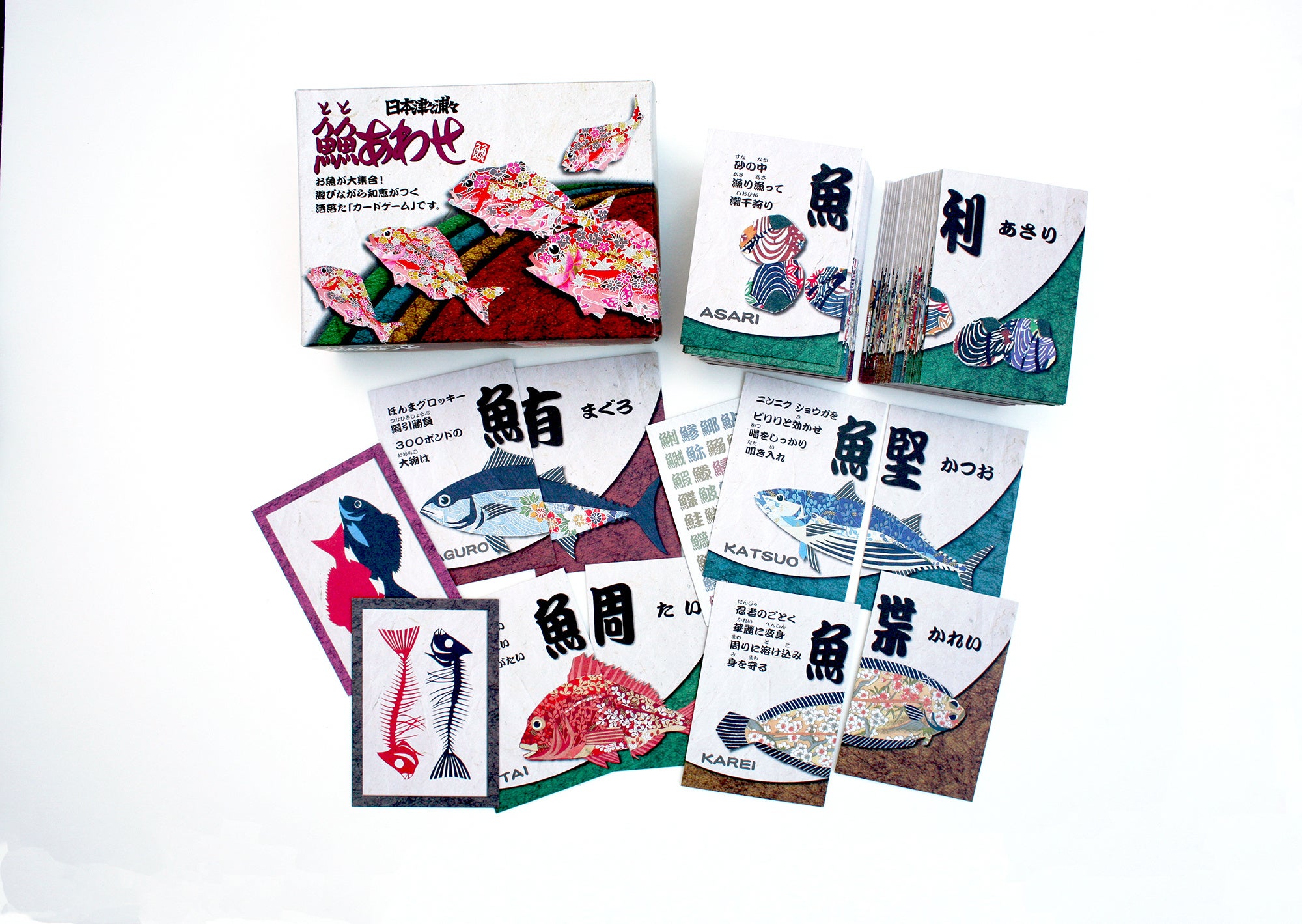 魚偏の漢字と色とりどりの千代紙・色紙の切り絵を使った絵合わせカルタです。小さなお子様からご年配の方までが一緒に遊びながら、魚について楽しく学べます。