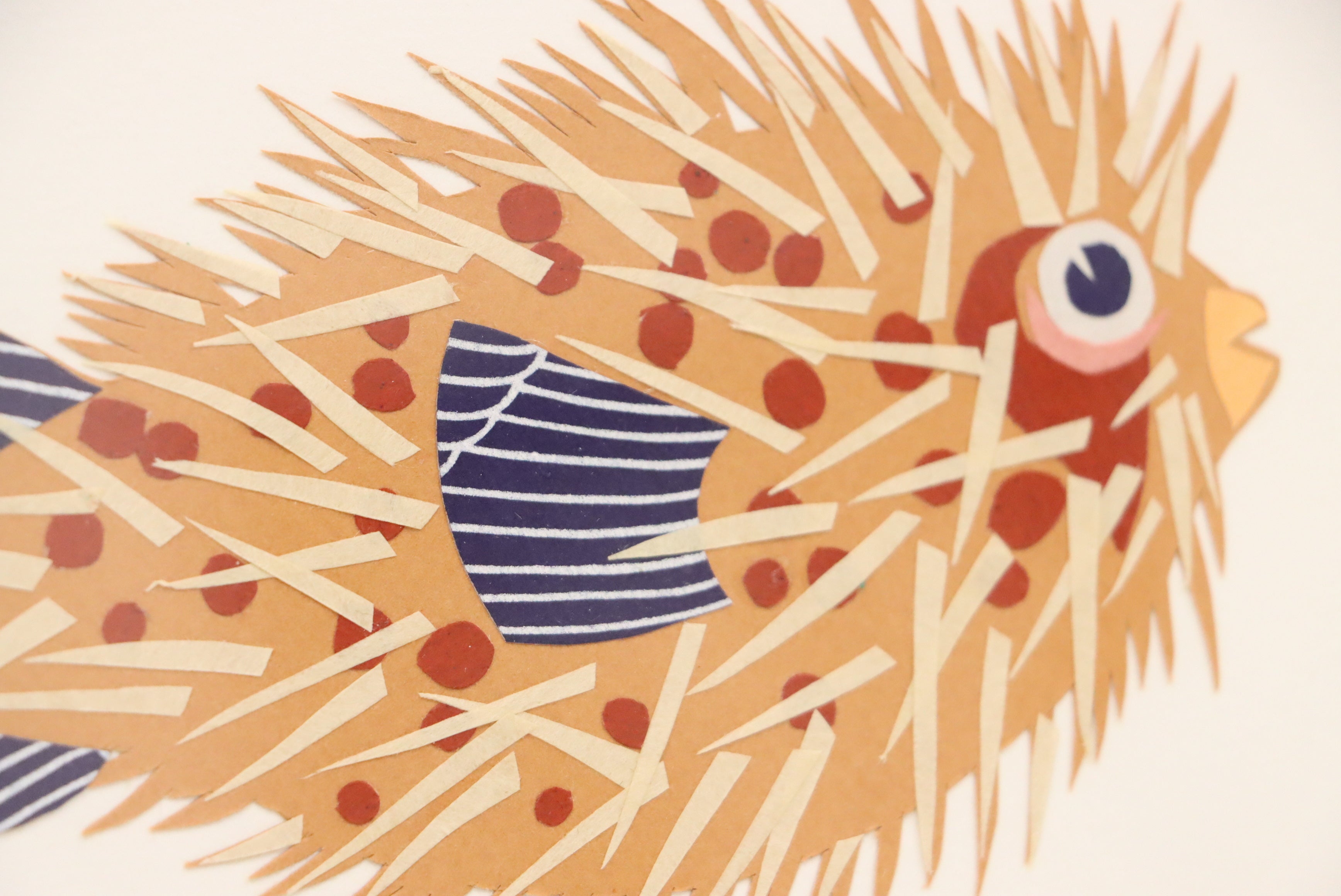 色とりどりの千代紙を使い、魚たちの美しさを表現しています。実際の色彩とは異なりますが、骨格やヒレの形といった特徴は正確に捉え、一目でその魚だと分かるようこだわった作品です。この原画展を通じて、魚たちが持つ本来の美しさや、アートとしての魅力に触れていただければ幸いです。