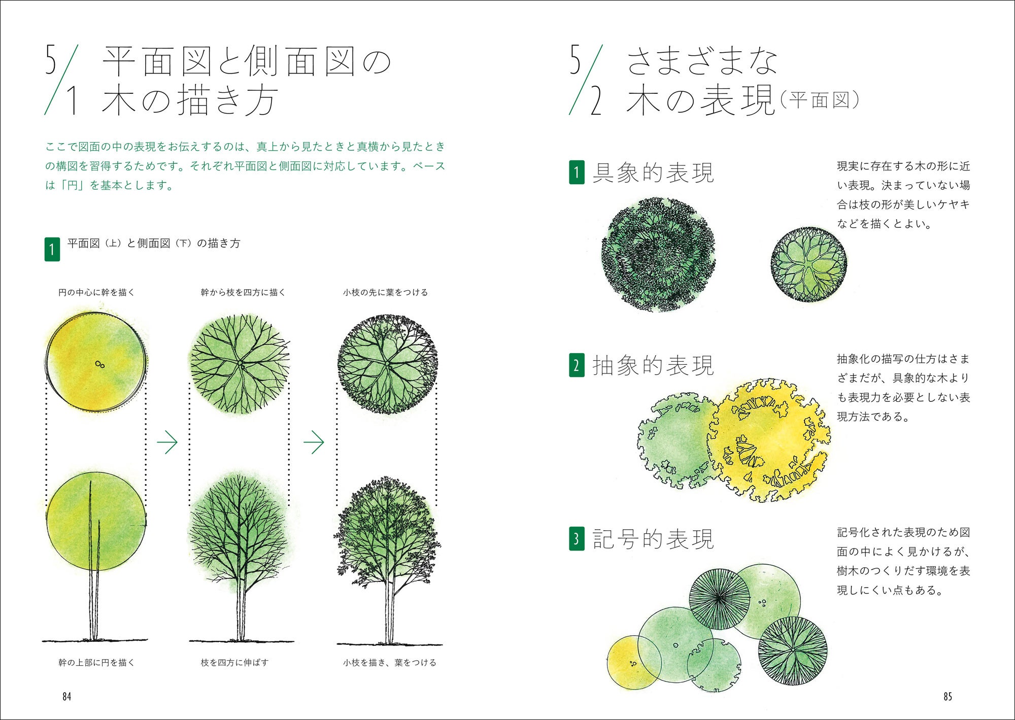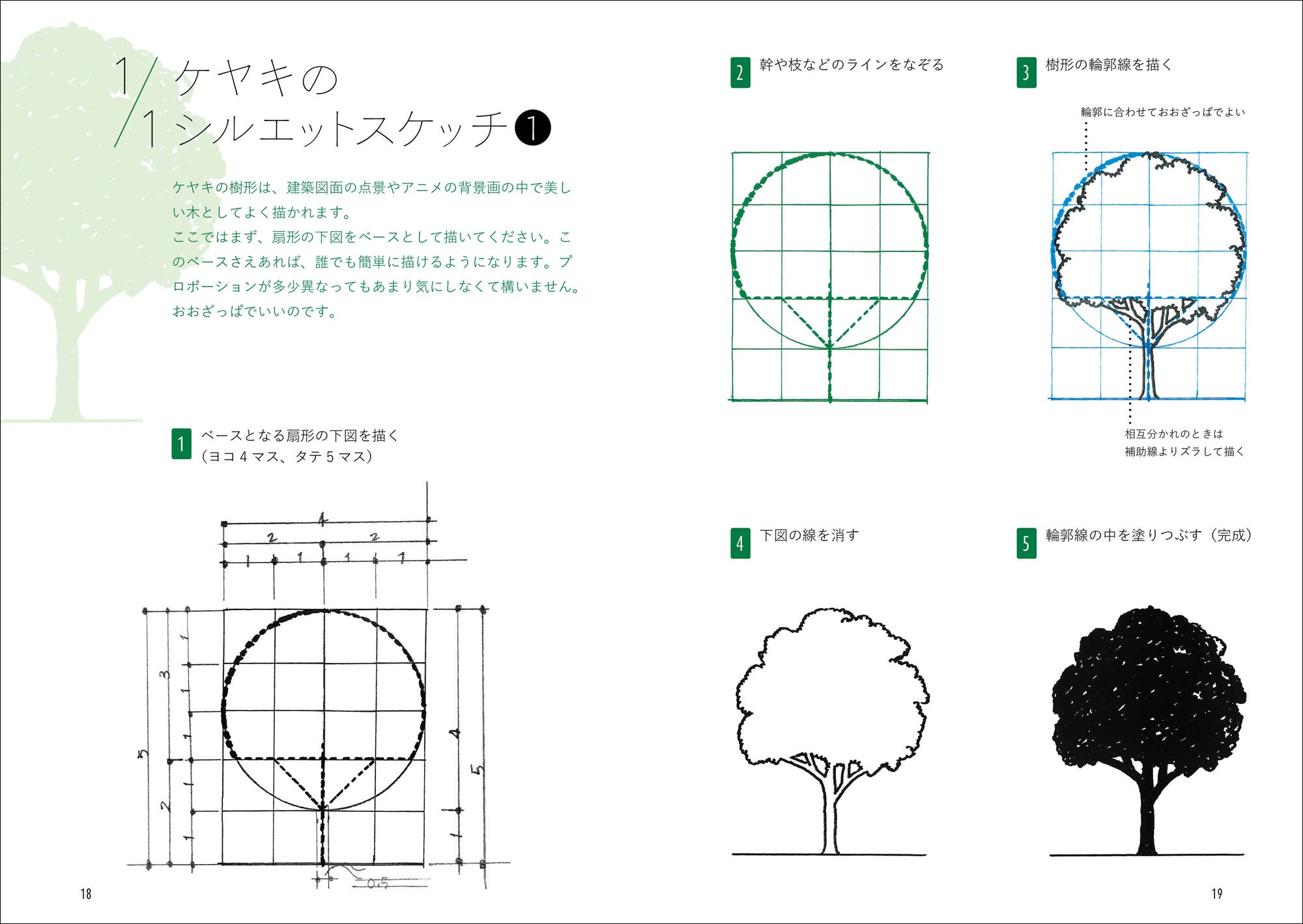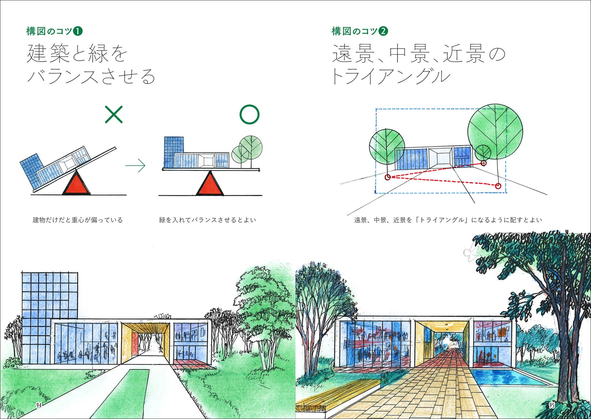 0章 緑のキホン/1章 シルエットスケッチ/2章 立体感のある美しい一本の木/3章 遠景、中景、近景としての緑/4章 斜め上から見た構図/5章 図面の中の緑/6章 構図のコツ/7章 着彩の工夫/8章 名作住宅を美しく彩る