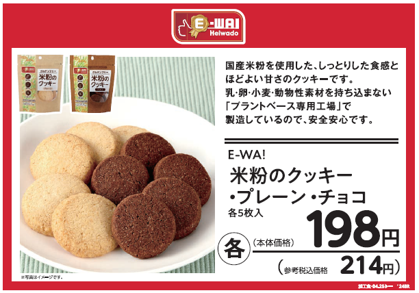 【平和堂】平和堂こだわりブランドE-WA! 新商品 「E-WA! 米粉のクッキー(プレーン・チョコ)」