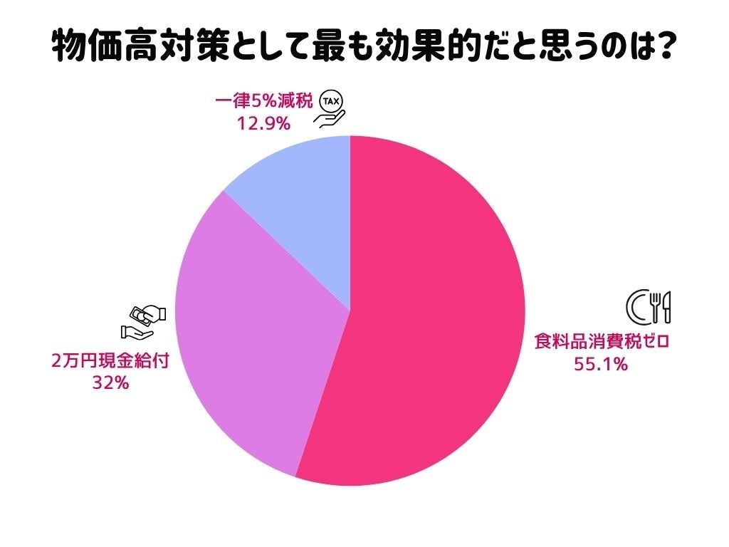 55.1%が「食料品の消費税ゼロ」を支持、次点は「2万円の現金給付」32%