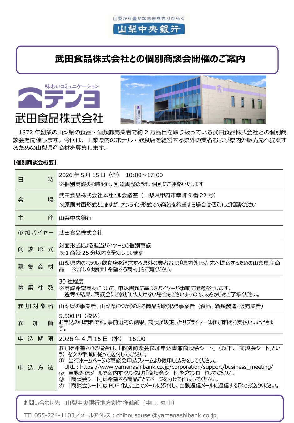 株式会社山梨中央銀行(頭取 古屋 賀章)は、お取引先の販路拡大および山梨県の地産品の消費拡大を目的に、県内事業者をサプライヤーとする個別商談会を開催します。