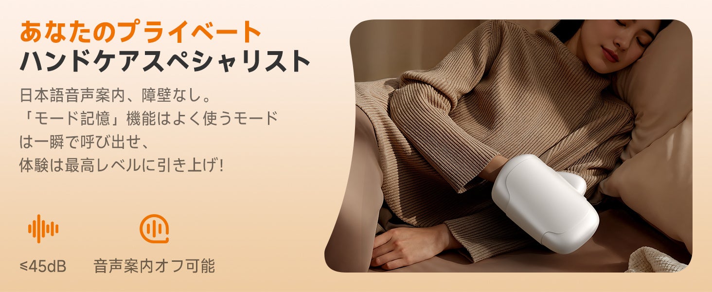 本製品は、手の曲線に沿ってエアバッグが密着するよう設計されており、手のひら・指先・手首までを包むようにケアします。