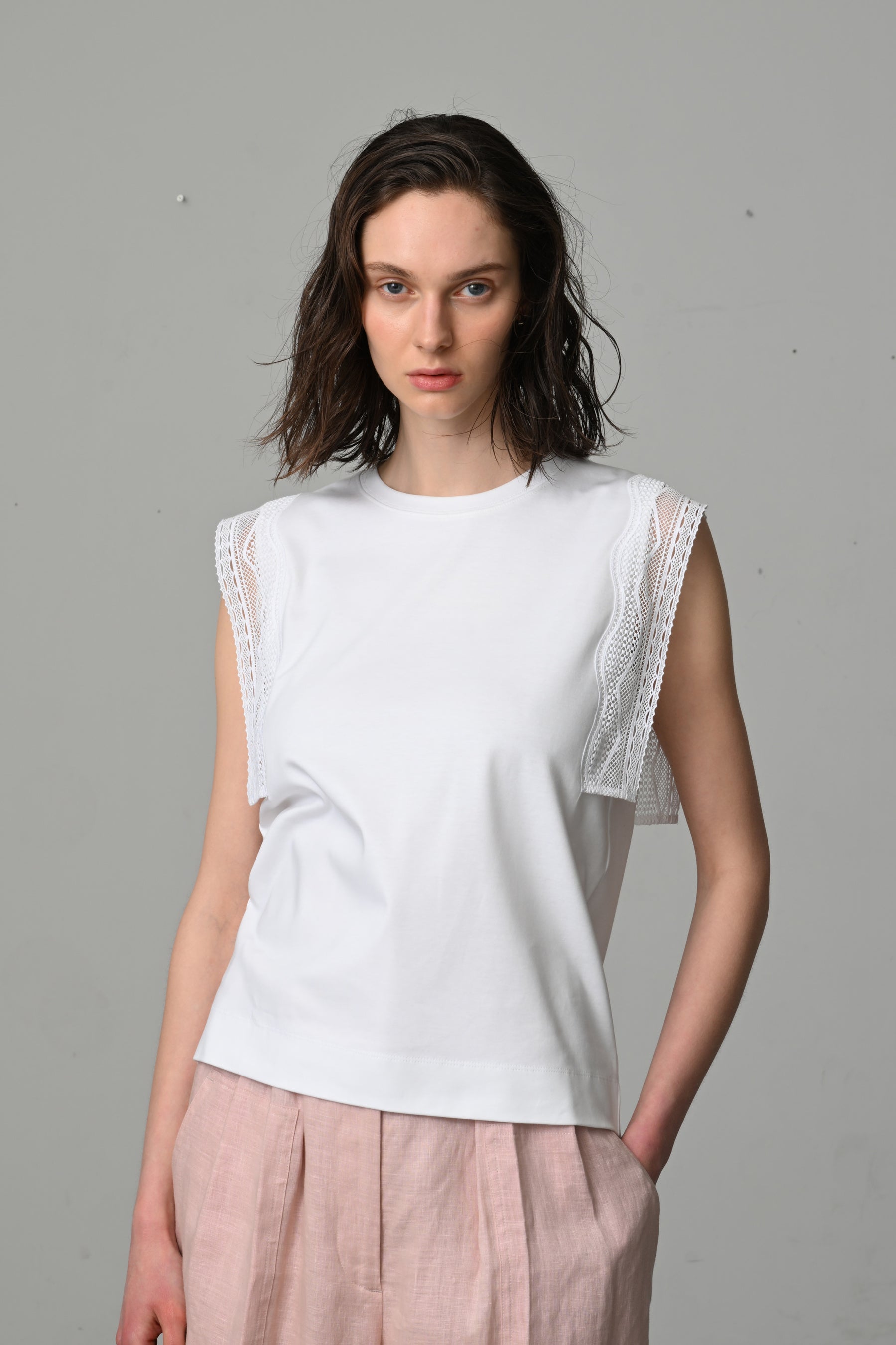スリーブレスデザインは、腕周りを程よく覆うようレースを配置。直線的なレースと縦長シルエットで、スッキリとしたスタイリングに。合わせるボトムスによって、IN・OUTどちらのスタイルも楽しめる丈感です。
