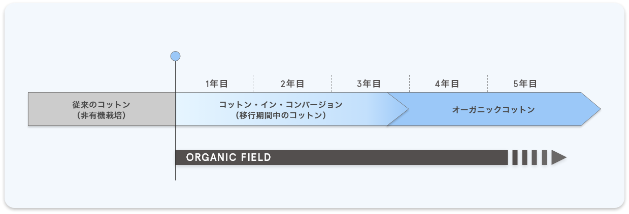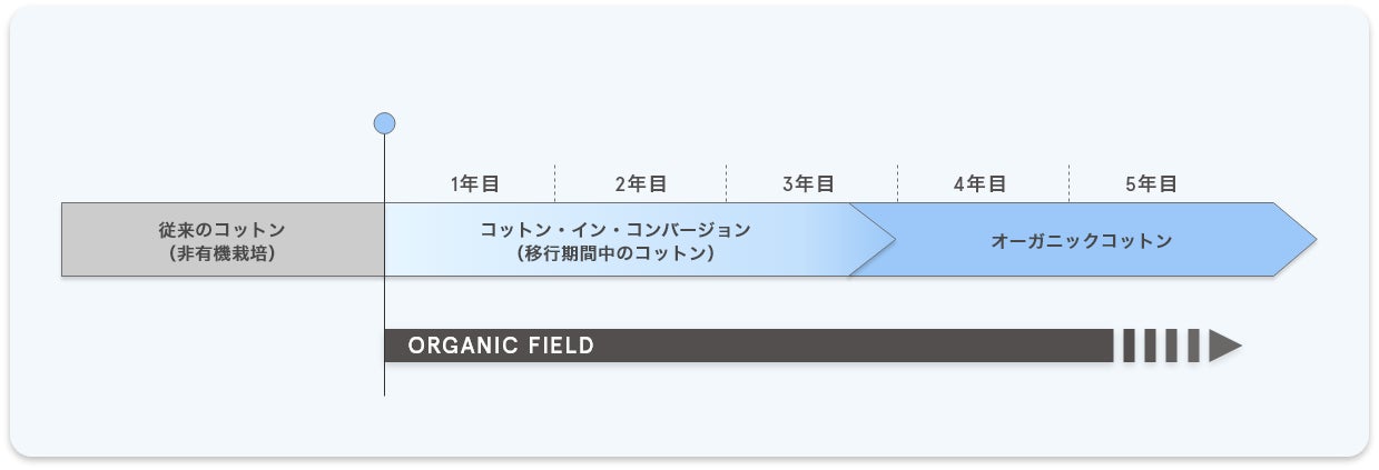 コットン栽培においては、従来の農法による環境負荷や、有機農法への移行に伴う農家の経済的課題が指摘されています。「コットン・イン・コンバージョン」は、従来農法から有機農法へ移行する過程で収穫されるコットンであり、農薬や化学肥料を使用せずに栽培されながらも、認証を得るまでの期間はオーガニックコットンとして扱われない素材です。移行期間中のコットンを適正な価格で流通させることで、農家が安心して有機栽培へ移行できる環境を支える仕組みとして、世界的に取り組みが広がっています。本企画で使用しているコットン・イン・コンバージョン素材は、繊維専門商社 スタイレム瀧定大阪株式会社が推進する「ORGANIC FIELD」の取り組みから生まれたものです。同社は、原料のトレーサビリティや生産背景の透明性を担保しながら、農家が有機栽培へ移行する過程を支える仕組みづくりを行っています。