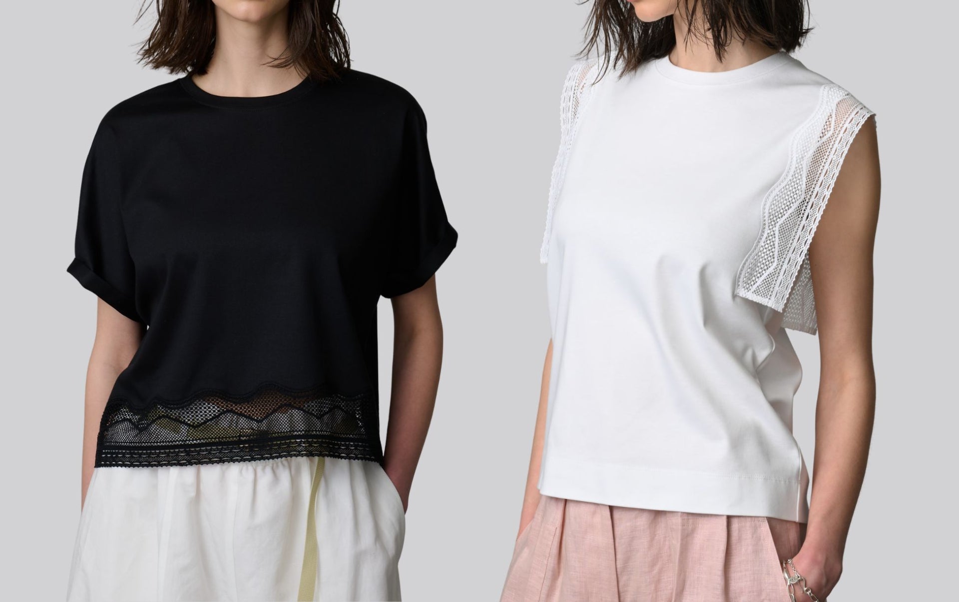 ミニマルで上品な続き袖デザインのTシャツは、スッキリとした短めの丈と、裾にレースをあしらうことで、より爽やかな軽さがあるスタイリングを楽しめます。