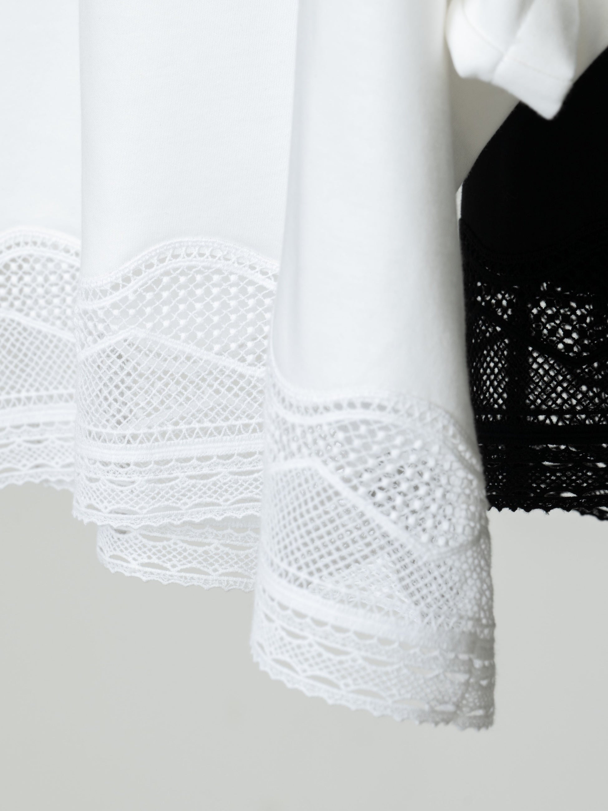 毛羽の少ない原料をハイゲージで編み立てたなめらかなスムース素材をベースに、デザインに合わせて幅や柄の方向を調整したレースをあしらいました。シンプルでありながらも心地よく、スタイリングに華やかさと高揚感をもたらします。