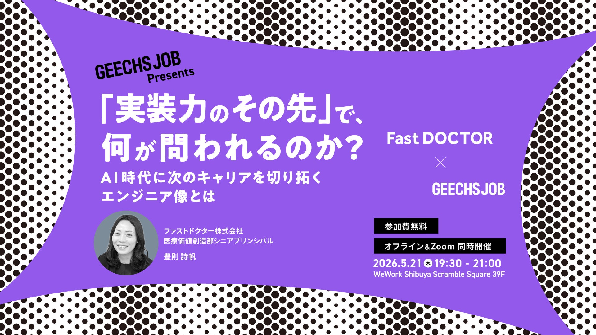 ギークスでは、ITエンジニア・ITエンジニア採用担当者を対象としたセミナーを定期的に実施しております。今回は「AI時代の生存戦略とドメイン知識」をテーマに、日本最大級の医療支援プラットフォームを展開するファストドクター株式会社の豊則 詩帆氏にご登壇いただきます。AIテック企業から医療現場の最前線に近い領域へと転身した同氏の視点から、プロトタイピングの真実や医療現場(高難度ドメイン)における技術介入のリアル、そして「コードを書くだけではない」エンジニアのキャリア戦略についてお話しいただきます。