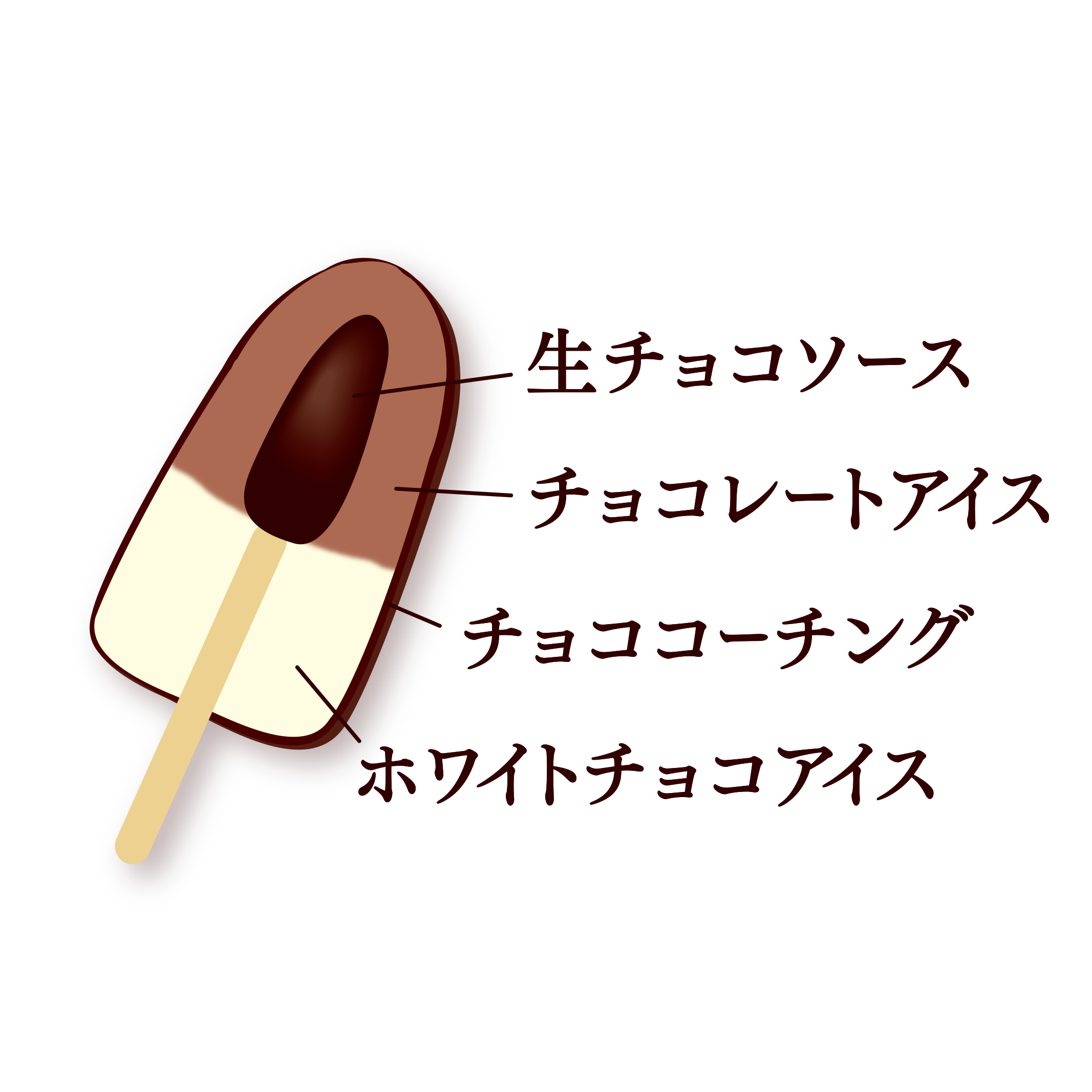 一口かじれば先端からとろっと出てくる生チョコソースが入ったチョコレートアイスクリームを、パリッとした食感が小気味良いカカオ香るチョココーチングで包みました。さらに、今回のリニューアルでは、チョコレートアイスとホワイトチョコアイスの2層構造にすることで、4種のチョコレートをお楽しみいただけるようになりました。