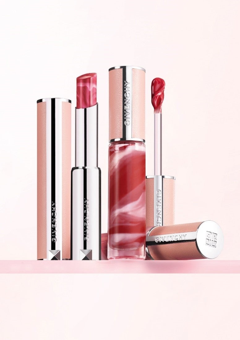 このマーブル状のテクスチュアは、鮮やかな発色と輝きをもたらすピグメントとスキンケア成分が溶け合ってできており、ジバンシイの新たなシンボルに。マーブル模様は塗布と同時に唇の表面でとろけて混ざり合い、ムラのない均一な発色を叶えます。