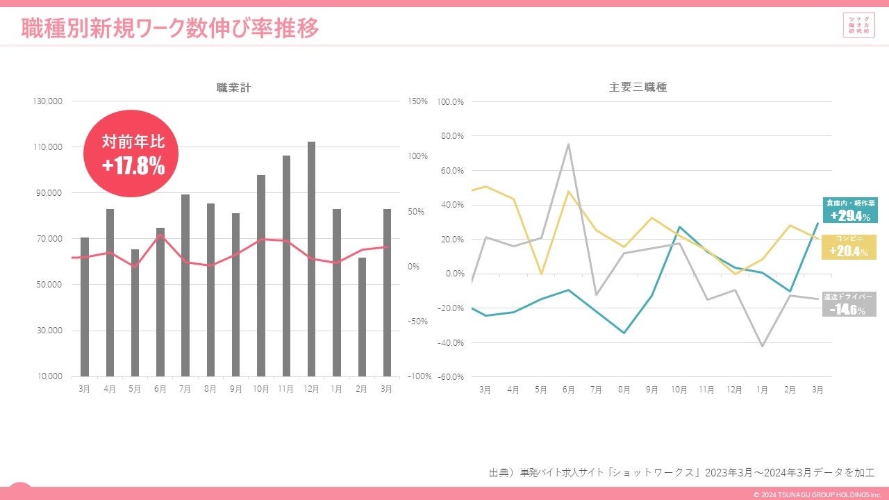 2.新規ワーク数は、前年比+17.8%。主要職種では倉庫内・軽作業が前年比+29.4%と伸長。
