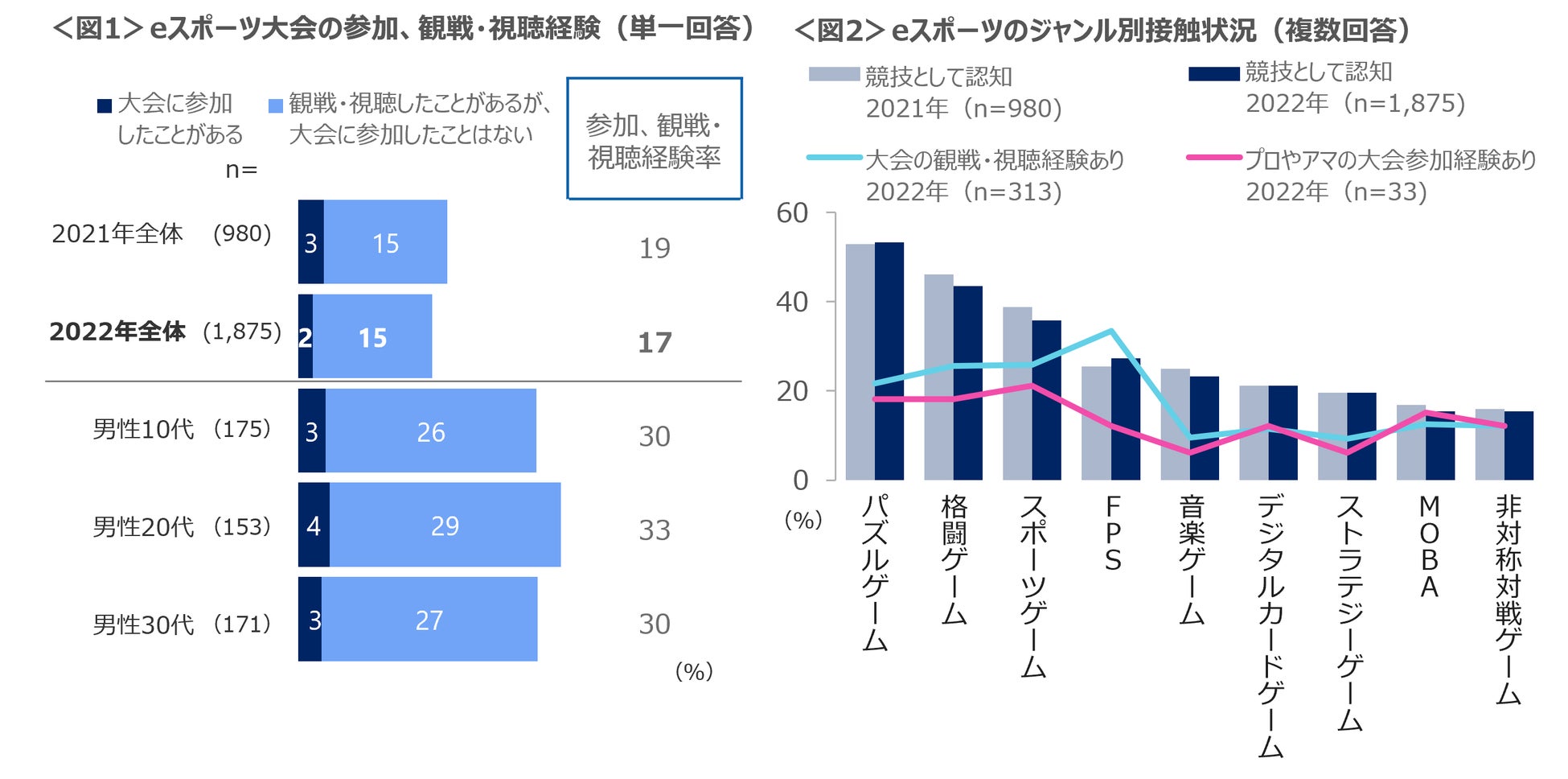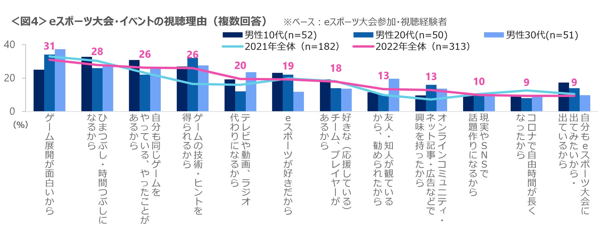 eスポーツ認知者のうち大会の参加や観戦経験は、男性10~30代で3割 観戦理由は「面白い」「ひまつぶし」「同じゲームをプレイ」「技術・ヒントの習得」