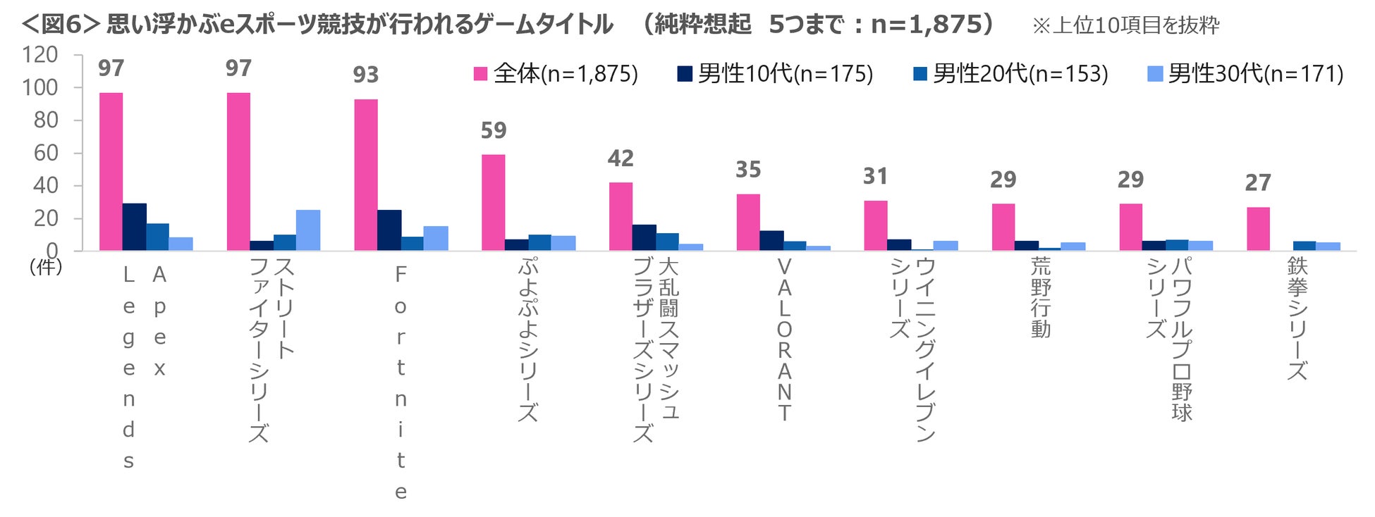eスポーツ競技で行われているゲームタイトルとして思い浮かぶものを5つまで記述式にて聴取した。「Apex Legends」「ストリートファイターシリーズ」「Fortnite」「ぷよぷよシリーズ」「大乱闘スマッシュブラザーズシリーズ」がTOP5。男性10代は「Apex Legends」「Fortnite」「大乱闘スマッシュブラザーズシリーズ」「VALORANT」が、男性30代は「ストリートファイターシリーズ」が他の世代より多くあげられていた。<図6>