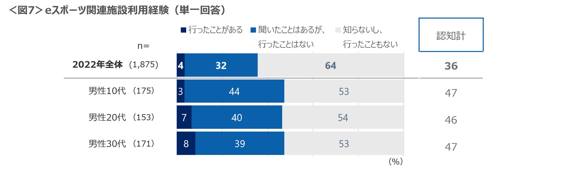 eスポーツカフェやパークの施設利用経験者は4%とわずか。eスポーツ関連施設があることを知らない人は64%と多かった。男性10代~30代は他世代と比べてeスポーツへの接触が高いが、関連施設の認知は半数に満たない結果であった。<図7>