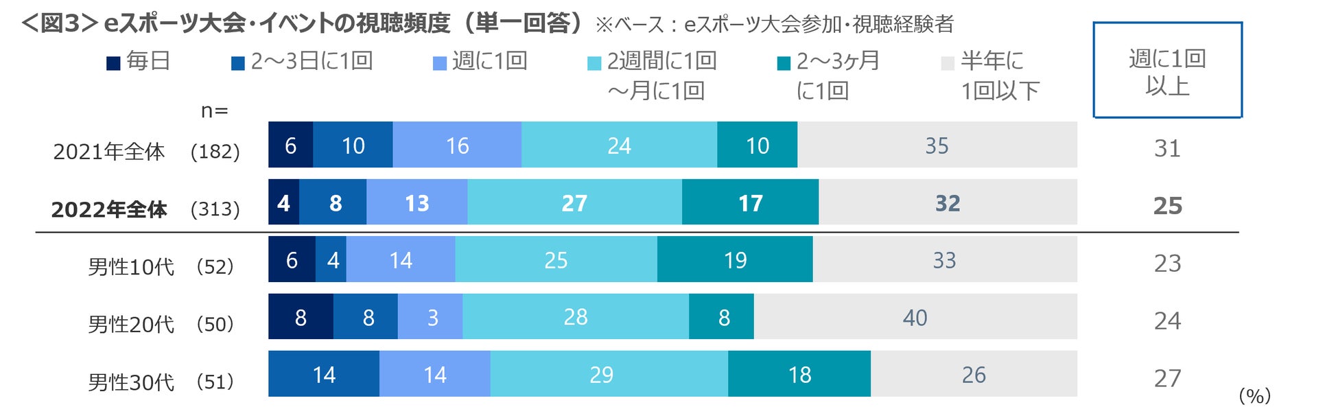 eスポーツの大会やイベントを視聴している人では、「週に1回以上」の視聴者が25%を占める。視聴頻度は昨年よりやや少なくなったと見受けられる。<図3>