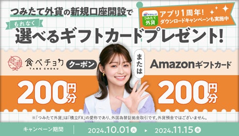 2024年10月に「つみたて外貨」口座を新しく口座開設いただいたお客さまにもれなくご希望のギフトカード(200円分)をプレゼントいたします。この機会に是非「つみたて外貨」サービスの口座開設をご検討ください。