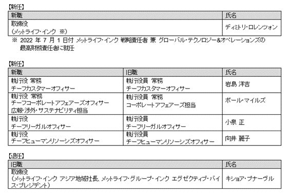 メットライフ生命保険株式会社(代表執行役 会長 社長 最高経営責任者 ディルク・オステイン)は、以下のとおり人事異動を決定しましたのでお知らせ致します。