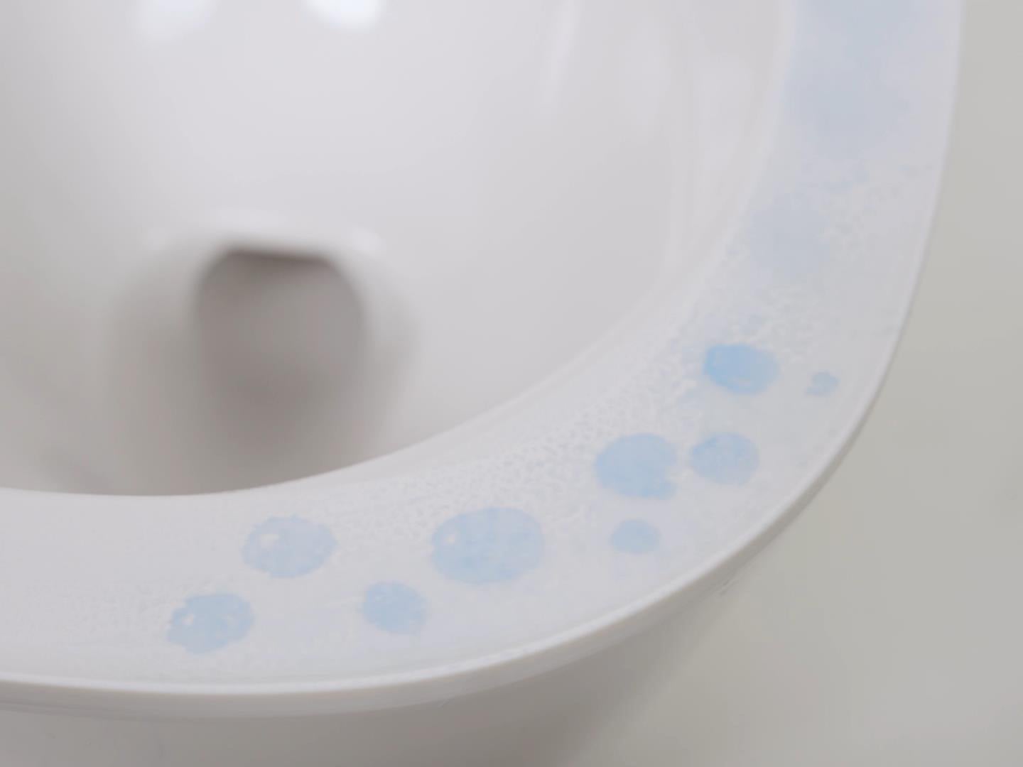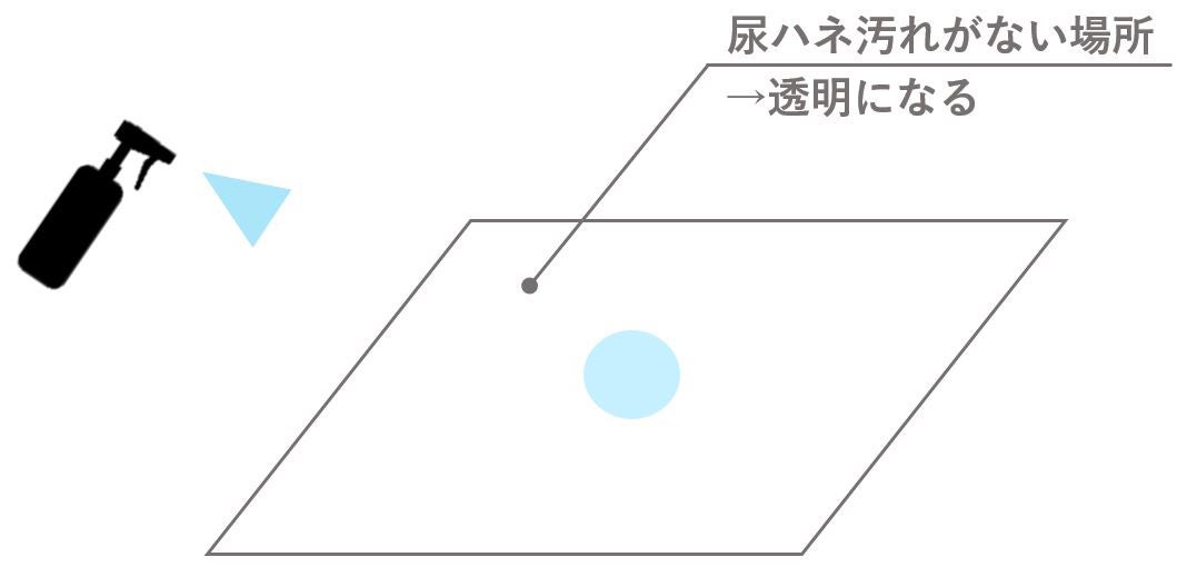 尿ハネ汚れがある場合、消色剤が尿ハネ汚れに作用するため、尿ハネ汚れ部のみ着色剤が残り青くなります。