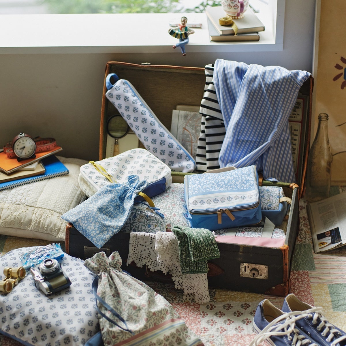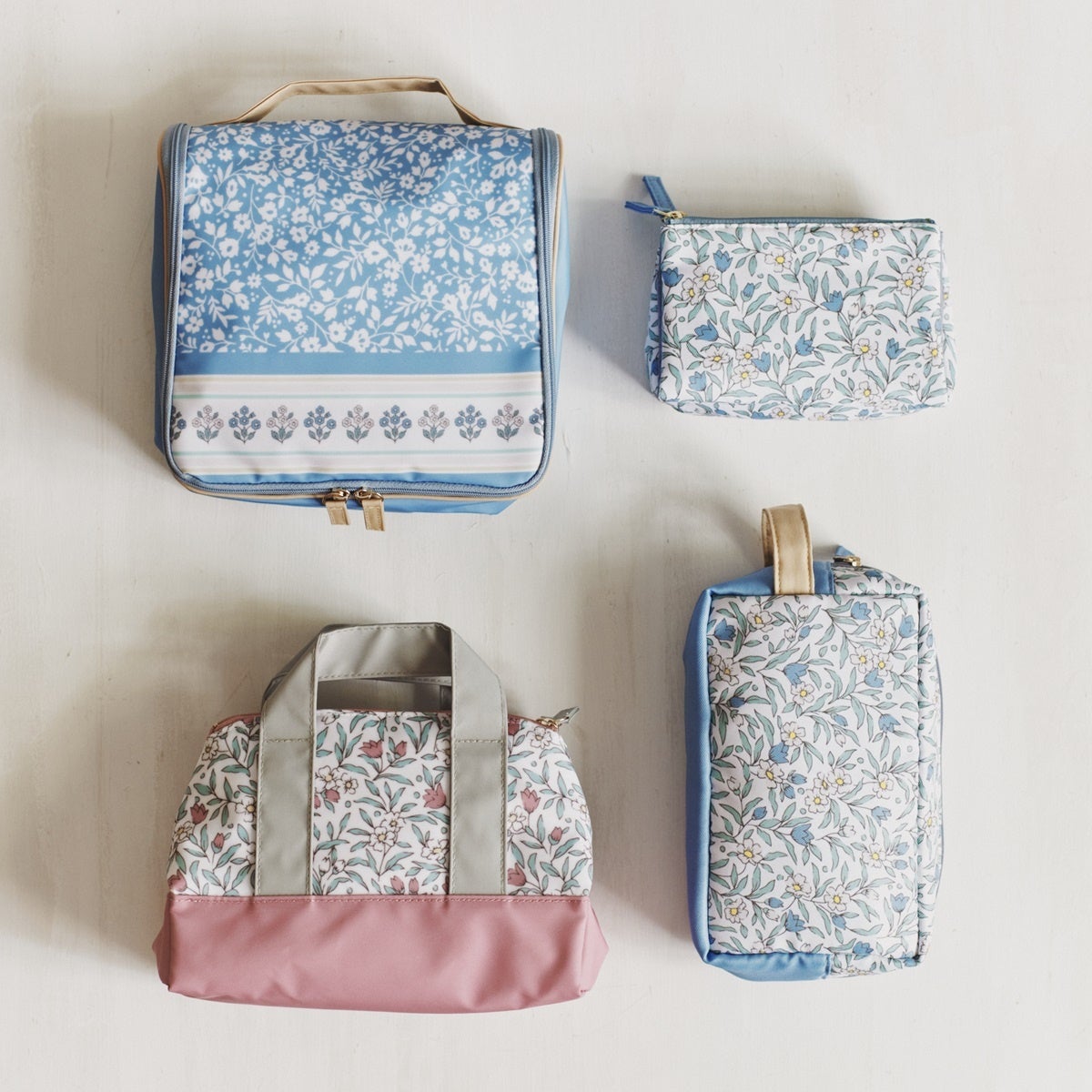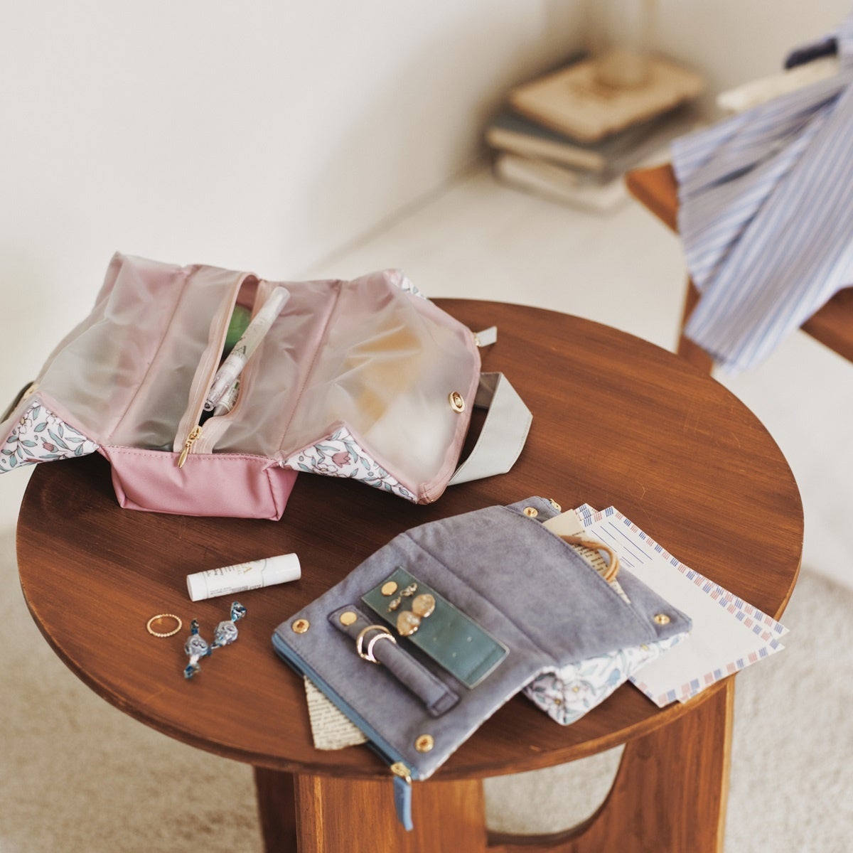 くすみカラーが大人っぽい、花柄のトラベルアイテム。コスメやアクセサリーを収納できるコスメアクセポーチや、洗面所やバスルームで吊るして使えるハンギングポーチなど、整理整頓に便利なアイテムが揃います。