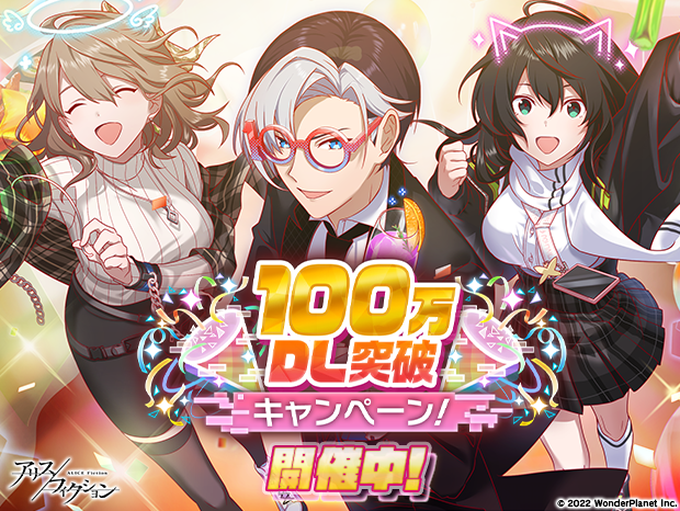 エンターテインメントサービス事業を行うワンダープラネット株式会社(本社:愛知県名古屋市、代表取締役社長CEO:常川友樹、東証グロース:証券コード4199、以下当社)は、好評配信中の新作スマートフォン向けゲーム『アリスフィクション』にて、全世界で100万ダウンロードを突破しました。感謝の気持ちを込めまして「100万DL突破キャンペーン」第1弾を開始したことをお知らせいたします。
